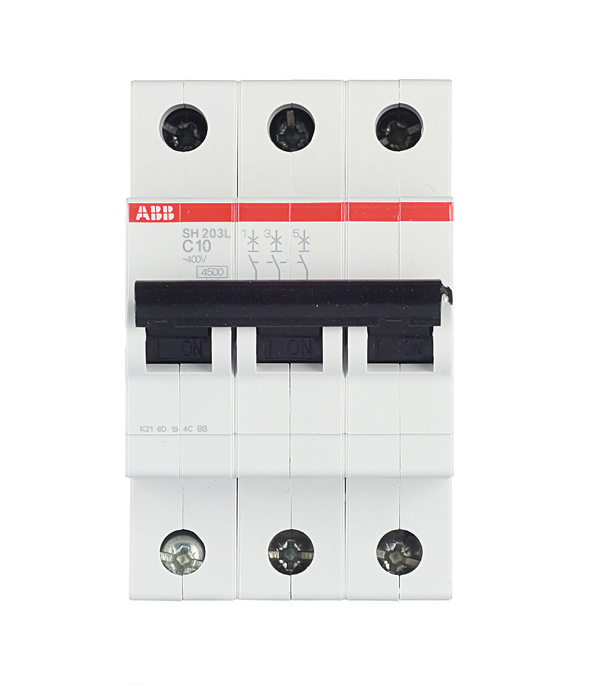 3Р – трехполюсной (используется в трехфазных сетях), 10А – величина номинального тока в амперах (ток, который автомат способен пропускать долгое время без отключения цепи), тип С – автомат срабатывает при токе в цепи в 5-10 раз больше номинального и применяется для защиты цепей розеток и освещения, 4,5кА – рабочая отключающая способность в килоамперах, АВВ – фирма производитель, SH200L – бытова (упрощенная) серия автоматов (без возможности подключения дополнительных устройств и без индикатора состояния цепи).