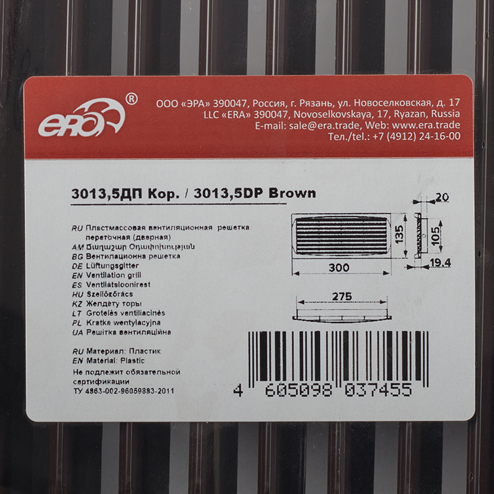 Решетка вентиляционная пластиковая переточная ERA 300х135 мм коричневая