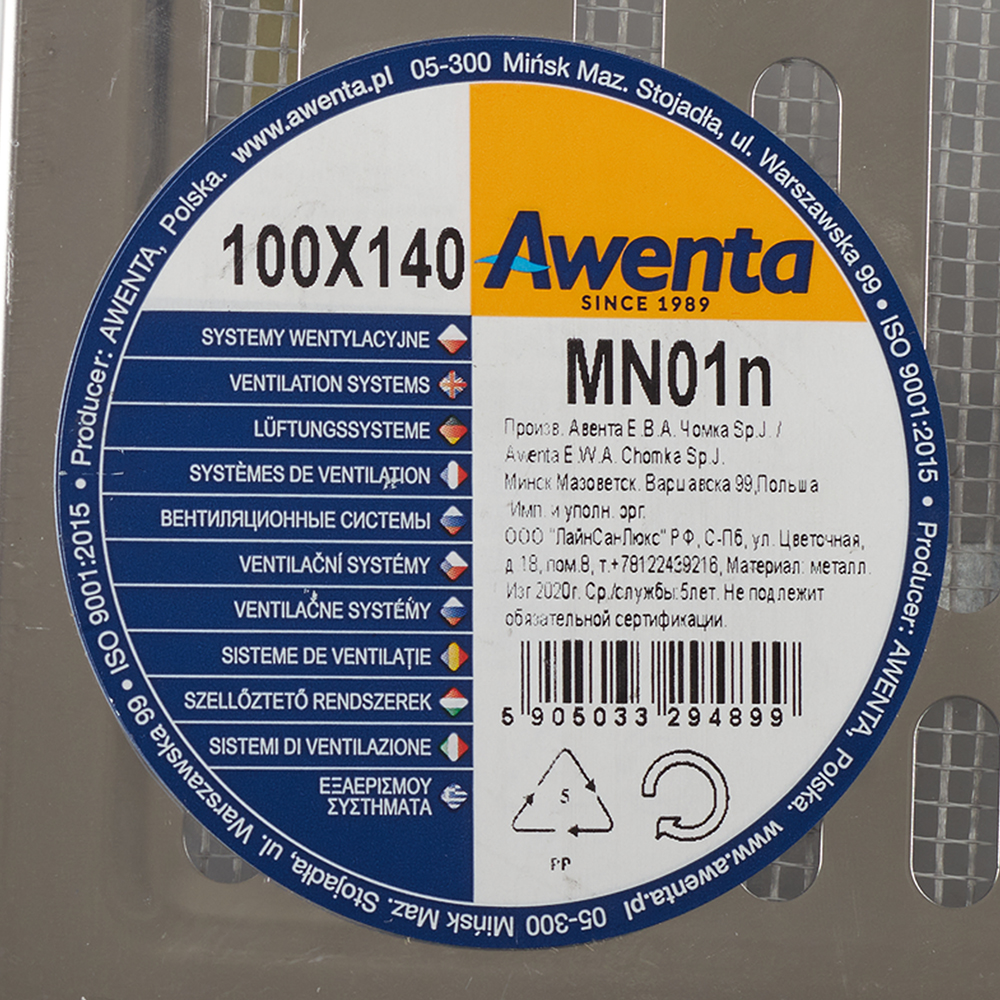Решетка вентиляционная нержавеющая сталь AWENTA MN01N 100х140 мм с сеткой