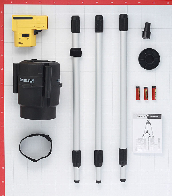 нивелир, комбинация штатива и телескопической рейки, три батарейки АА.