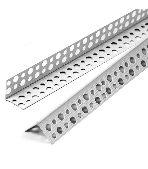 - Профиль углозащитный имеет перфорацию в виде отверстий разного диаметра. При установке профиля в отверстия проникает штукатурка или шпаклевка, предварительно нанесенная на угол конструкции, что позволяет обеспечить прочное сцепление профиля с поверхностью стен.