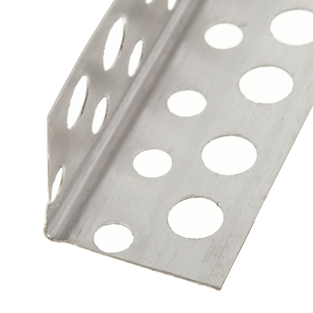 - Профиль углозащитный имеет перфорацию в виде отверстий разного диаметра. При установке профиля в отверстия проникает штукатурка или шпаклевка, предварительно нанесенная на угол конструкции, что позволяет обеспечить прочное сцепление профиля с поверхностью стен.