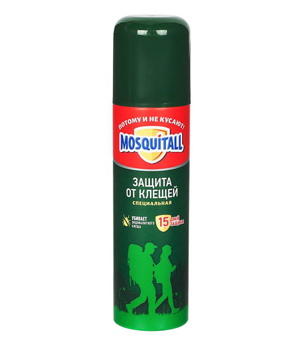 Аэрозоль от клещей Mosquitall Защита для взрослыхобеспечивает высокую степень защиты от лесных и таежных клещей и обладает двойным действием – уничтожает клещей и надежно отпугивает комаров и других кровососущих насекомых.rnСредство необратимо парализует дыхательную систему клеща, в результате чего клещ погибает в течение нескольких минут, даже если он успевает переползти с обработанной одежды на кожу.rnАктивная формула – совместная разработка компании с НИИ Дезинфектологии.