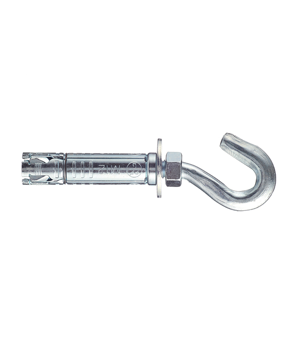 Предназначен для монтажа тяжелых и умеренно тяжелых элементов и конструкций в таких материалах, как бетон и природный камень. Анкер имеет большую зону расклинивания, которая позволяет производить монтаж в основания низкого качества, например, при работах в зданиях старой постройки, а также, когда сложно определить структуру материала основания. Изготовлен из оцинкованной стали. Анкер представляет собой металлический кованый болт-крюк с гайкой и шайбой, на котором установлена 4-х лепестковая распорная гильза с резьбой на внутренней части.