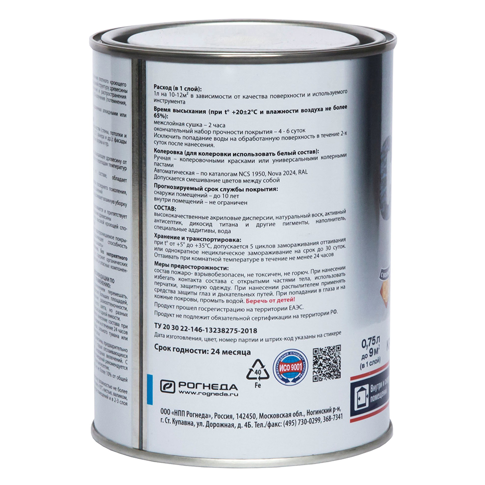 высококачественные акриловые дисперсии, натуральный воск, активный антисептик, диоксид титана, пигменты, наполнитель, специальные аддитивы, вода.