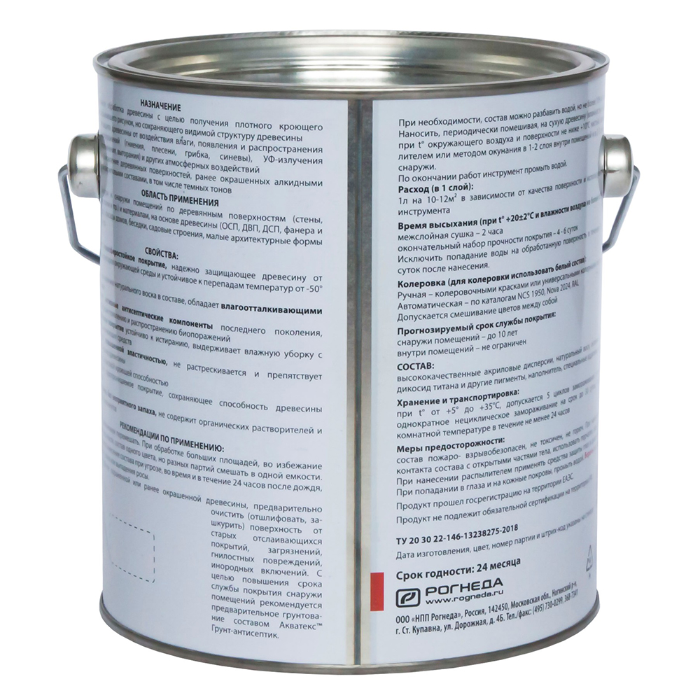 образует атмосферостойкое покрытие, надежно защищающее древесину от негативных факторов окружающей среды и устойчивое к перепадам температур от -50⁰С до +50⁰Сrnблагодаря наличию натурального воска в составе, обладает влагоотталкивающими свойствамиrnсодержит активные антисептические компоненты последнего поколения, препятствующие появлению и распространению биопораженийrnдолговечное покрытие устойчиво к истиранию, выдерживает влажную уборку с применением моющих средствrnобладает повышенной эластичностью, не растрескивается и препятствует растрескиванию древесиныrnотличается высокой кроющей способностьюrnобразует паропроницаемое покрытие, сохраняющее способность древесины «дышать» rnэкологичен, без неприятного запаха, не содержит органических растворителей и опасных компонентовrnПеред применением перемешать. При обработке больших площадей, во избежание разнооттеночности, состав одного цвета, но разных партий смешать в одной емкости. rnНе рекомендуется окрашивать контактирующие между собой поверхности (окна, двери, мебель и пр.), а также полы, ступени и пр.rnЗапрещается нанесение состава при угрозе, вовремя и в течение 24 часов после дождя, сильного тумана или выпадения росы. При обработке, пораженной или ранее окрашенной древесины, предварительно очистить (отшлифовать, зашкурить) поверхность от старых отслаивающихся покрытий, загрязнений, гнилостных повреждений, инородных включений. С целью повышения срока службы покрытия снаружи помещений рекомендуется предварительное грунтование составом Акватекс™ Грунт-антисептик. Исключить попадание воды на обработанную поверхность в течение 2-х суток после нанесения.