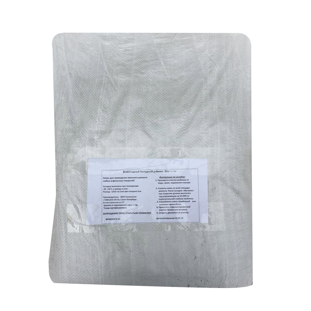 Холодный асфальт представляет собой готовую смесь из мелкого щебня, битума и специальной добавки, которая позволяет обеспечить максимально быстрое отвердевание материала. Используется смесь для ремонта дорожных покрытий. Ремонт можно производить в любую погоду при температуре от –20°С до +40°С, в том числе при наличии осадков. Сразу после укладки холодного асфальта по нему может двигаться автотранспорт, при этом отремонтированный участок прослужит не меньше, чем само ремонтируемое покрытие. Производство Холодного асфальта проходит при более низкой температуре (+70… +80 °С), чем обычного — горячего или тёплого. Уникальность этого материала в том, что его можно использовать при температуре воздуха до –20°С. rnВ прохладное время года холодный асфальт перестает быть рассыпчатым. rnРекомендуем поместить его на некоторое время в теплое помещение. rnМожно воспользоваться тепловой пушкой. rnЗАПРЕЩЕНО нагревать открытым пламенем!!
