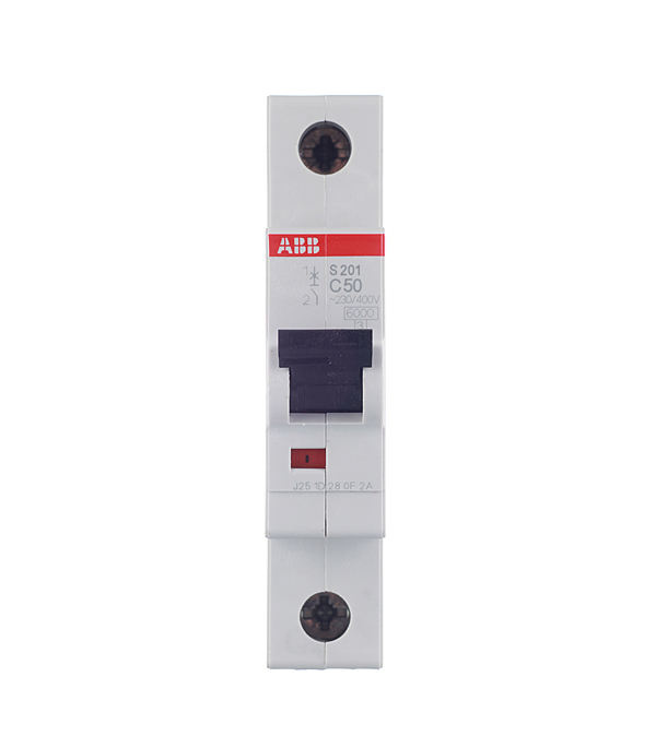 1Р – однополюсной (используется в однофазных сетях), 50А – величина номинального тока в амперах (ток, который автомат способен пропускать долгое время без отключения цепи), тип С – автомат срабатывает при токе в цепи в 5-10 раз больше номинального и применяется для защиты цепей розеток и освещения, 6кА – рабочая отключающая способность в килоамперах, АВВ – фирма производитель, S200 – серия автоматов.