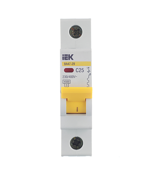 1Р – однополюсной (используется в однофазных сетях), 25А – величина номинального тока в амперах (ток, который автомат способен пропускать долгое время без отключения цепи), тип С – автомат срабатывает при токе в цепи в 5-10 раз больше номинального и применяется для защиты цепей розеток и освещения, 4.5кА – рабочая отключающая способность в килоамперах, ИЭК – фирма производитель, ВА 47-29 – серия автоматов.