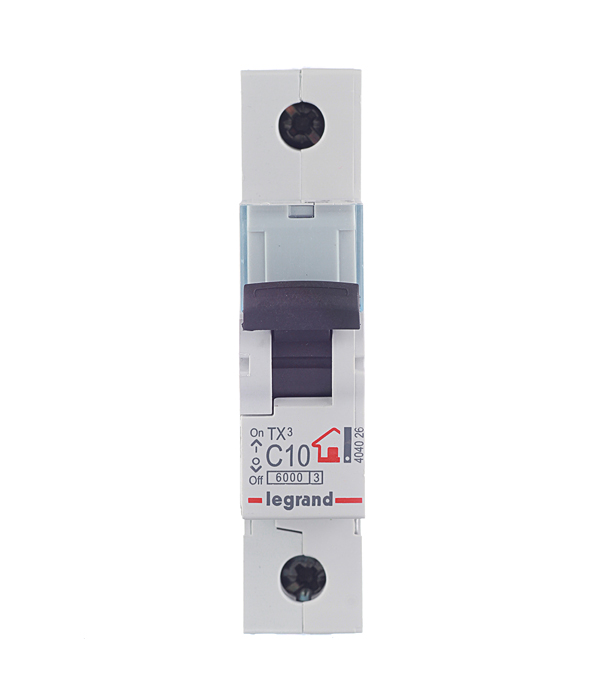 1P – однополюсной (используется в однофазных сетях), 10А – величина номинального тока в амперах (ток, который автомат способен пропускать долгое время без отключения цепи), тип С – автомат срабатывает при токе в цепи в 5-10 раз больше номинального и применяется для защиты цепей розеток и освещения, 6кА – рабочая отключающая способность в килоамперах, TX3 – серия автоматов.