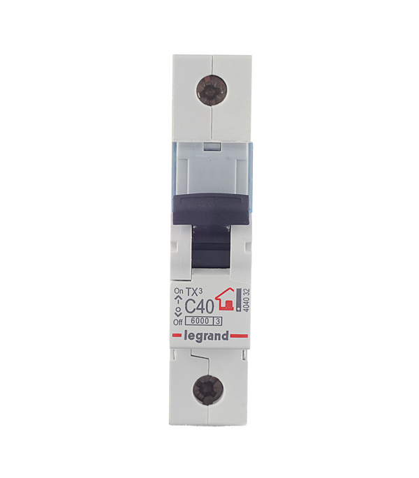 1P – однополюсной (используется в однофазных сетях), 40А – величина номинального тока в амперах (ток, который автомат способен пропускать долгое время без отключения цепи), тип С – автомат срабатывает при токе в цепи в 5-10 раз больше номинального и применяется для защиты цепей розеток и освещения, 6кА – рабочая отключающая способность в килоамперах, TX3 – серия автоматов.