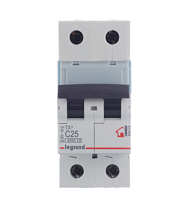 2P – двухполюсной (служит для разрывания фазного и нулевого проводников), 25А – величина номинального тока в амперах (ток, который автомат способен пропускать долгое время без отключения цепи), тип С – автомат срабатывает при токе в цепи в 5-10 раз больше номинального и применяется для защиты цепей розеток и освещения, 6кА – рабочая отключающая способность в килоамперах, TX3 – серия автоматов.