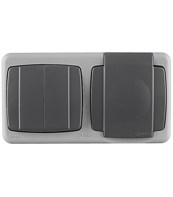 Блок выключателя с розеткой Makel 36064208 двухклавишный открытая установка серый с заземлением IP55 с быстрозажимными контактами