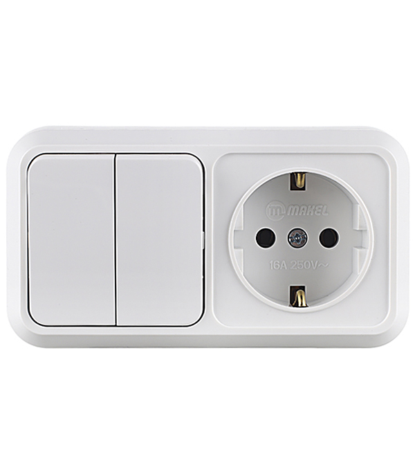 Блок выключателя с розеткой Makel Siva Ustu 451A2 двухклавишный открытая установка белый с заземлением со шторками