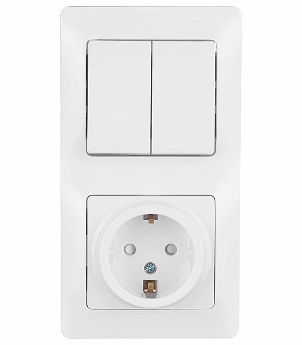 Блок выключателя с розеткой с рамкой Schneider Electric Glossa GSL000174 двухклавишный скрытая установка белый с заземлением со шторками