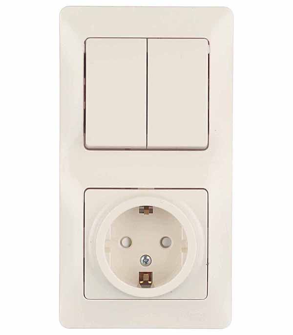 Блок выключателя с розеткой с рамкой Schneider Electric Glossa GSL000274 двухклавишный скрытая установка бежевый с заземлением со шторками