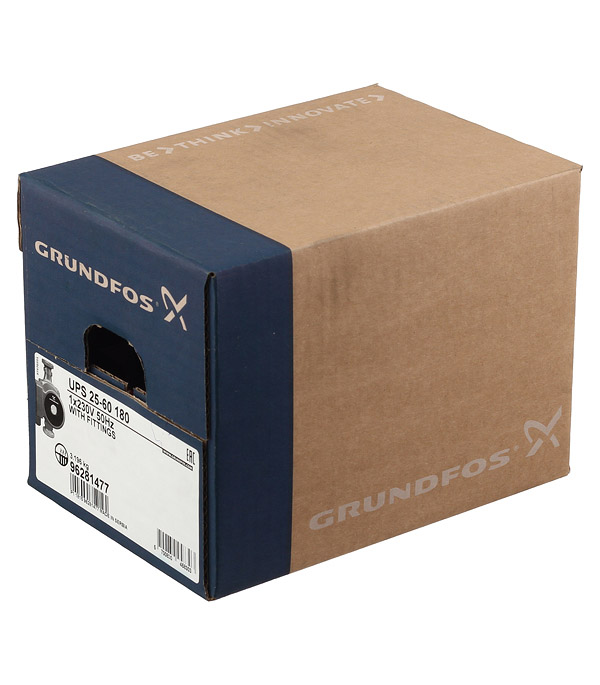 Насос циркуляционный Grundfos UPS 25/60 с гайками – 1 шт., гайки с гальваническим покрытием и с прокладками для входного и выходного патрубка G 1 1/2 x Rp1, инструкция по эксплуатации, упаковка.