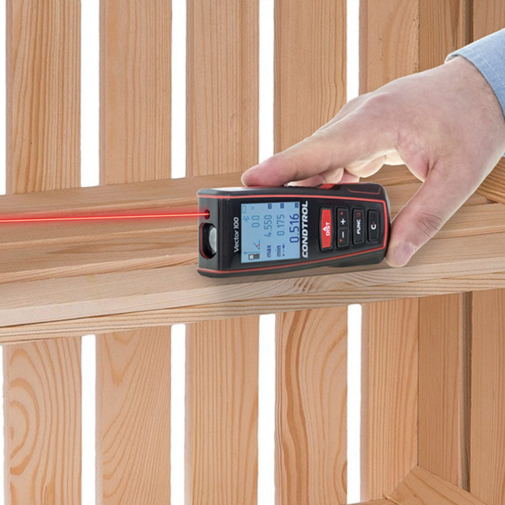IP 54. Лазерный дальномер CONDTROL Vector 100 оснащён герметичным корпусом, защищающим прибор от пыли и брызг воды. Прорезиненные кнопки не мешают проводить замеры в перчатках. Это дает возможность использовать CONDTROL Vector 100 в условиях стройплощадки.