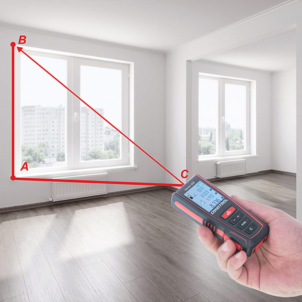 Одно из главных достоинств лазерного дальномера CONDTROL Vector 100 – возможность измерения расстояния между двумя произвольными точками в пространстве. Это достигается благодаря встроенному 3D-акселерометру, позволяющему всего по двум замерам определить длину отрезка, проходящего сквозь здания или препятствия (стена, деревья, забор).