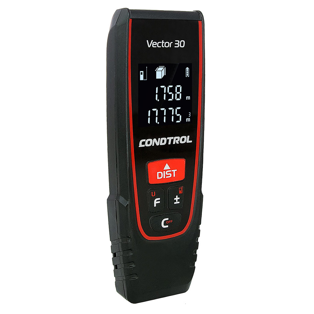 Дальномер CONDTROL Vector 30 – лазерный дальномер с базовым набором функций, предназначенный для точного измерения расстояния.rnПрибор выполняет автоматические вычисления площади, объёма помещения, позволяет складывать и вычитать полученные значения. Функция косвенных вычислений по теореме Пифагора позволит выполнять замеры в труднодоступных местах. Лазерная рулетка Vector 30 обладает простым и понятным интерфейсом. На корпусе располагаются четыре кнопки управления, каждая из которых отвечает за указанную функцию. Двухстрочный дисплей с подсветкой позволяет работать в условиях низкой освещенности.rnБлагодаря небольшим габаритам дальномер легко помещается в карман, а герметичный корпус обеспечивает изоляцию от мелкой пыли и капель воды.