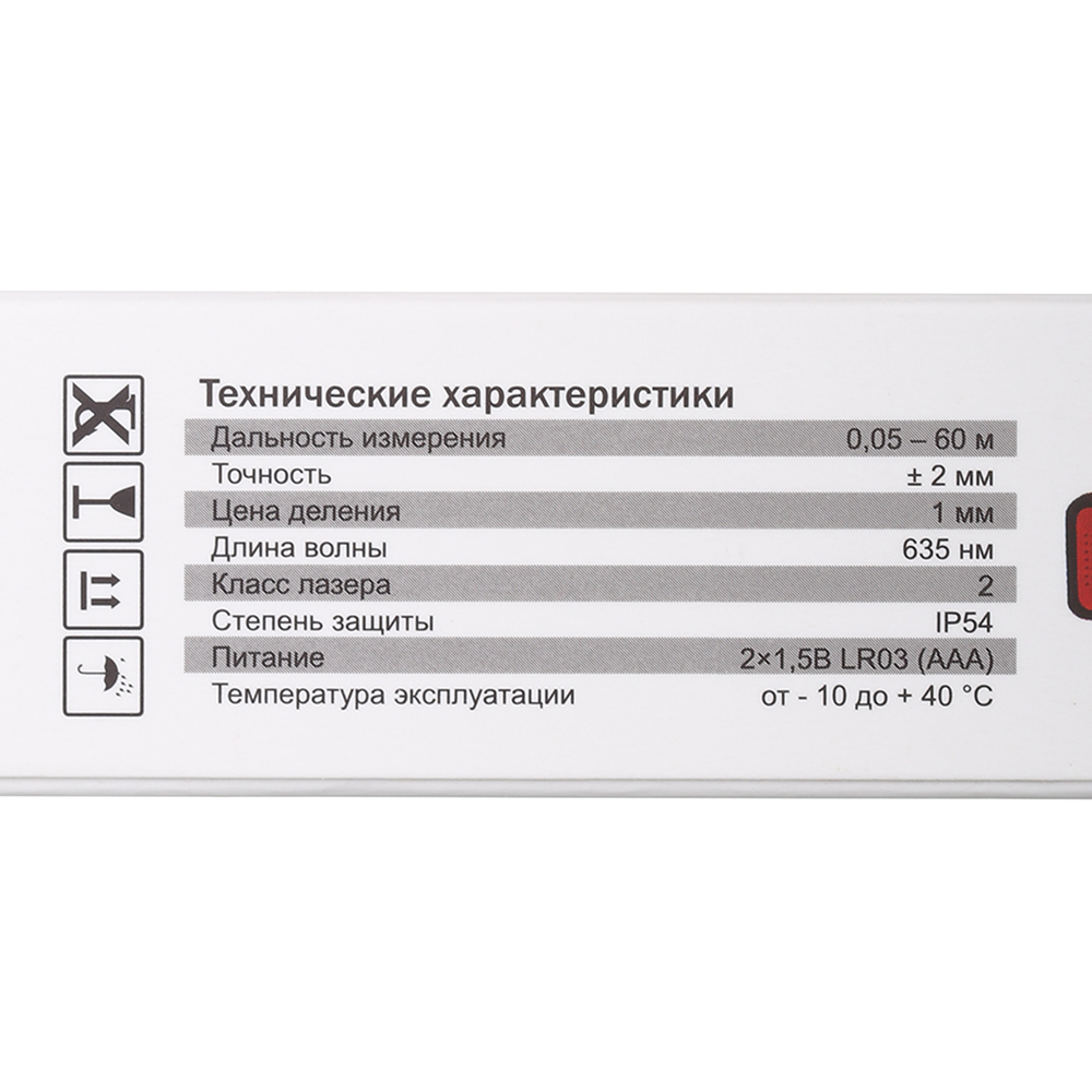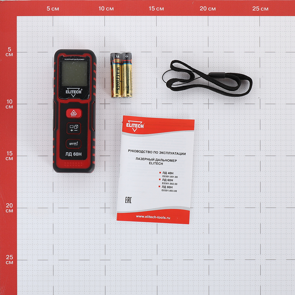 Лазерный дальномер, ремешок, подвес на руку, элементы питания 1,5В LR03 (ААА) – 2 шт, руководство по эксплуатации.