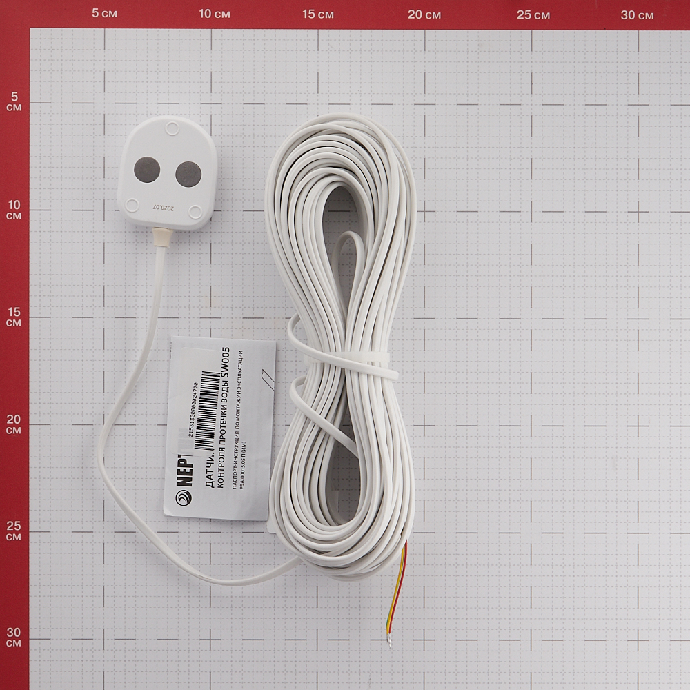 Датчик контроля протечки воды SW005-20,0. Способ передачи сигнала проводной.rnМаксимальное удаление от контроллера 100 м. Возможно удлинение до 500 м при работе с модулями управления Base, ProW, ProW+. Применять провод НП 3×0,12.rnСовместимость с модулями управления СКПВ220В-мини2N, СКПВ220В-DIN, СКПВ12В-DIN, Neptun Base, Neptun ProW, Neptun ProW+, Neptun ProW+ WiFi, блок расширения проводных датчиков ProW.