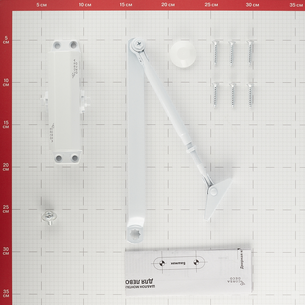 доводчик, рычаг, декоративная заглушка, комплект крепежа.