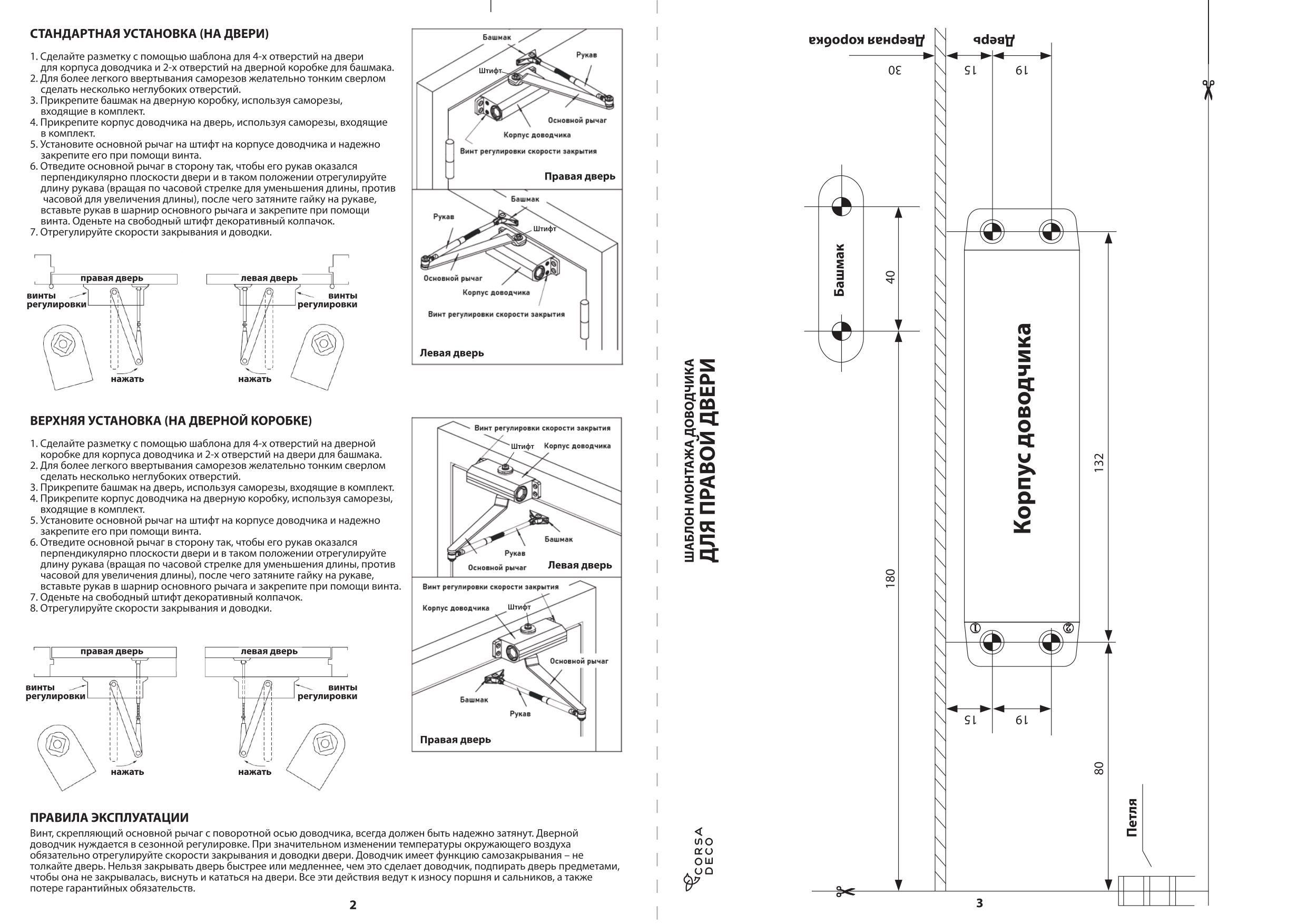 Предназначен для управления процессом открывания и закрывания дверей. Дверной доводчик устанавливается на двери, имеющие размеры дверного полотна до 900х2000 мм или массу от 25 до 45 кг. Двухступенчатая регулировка скорости (180°-20° и 20°-0°).rnРегулируемая скорость закрывания двери и скорость окончательной доводки.