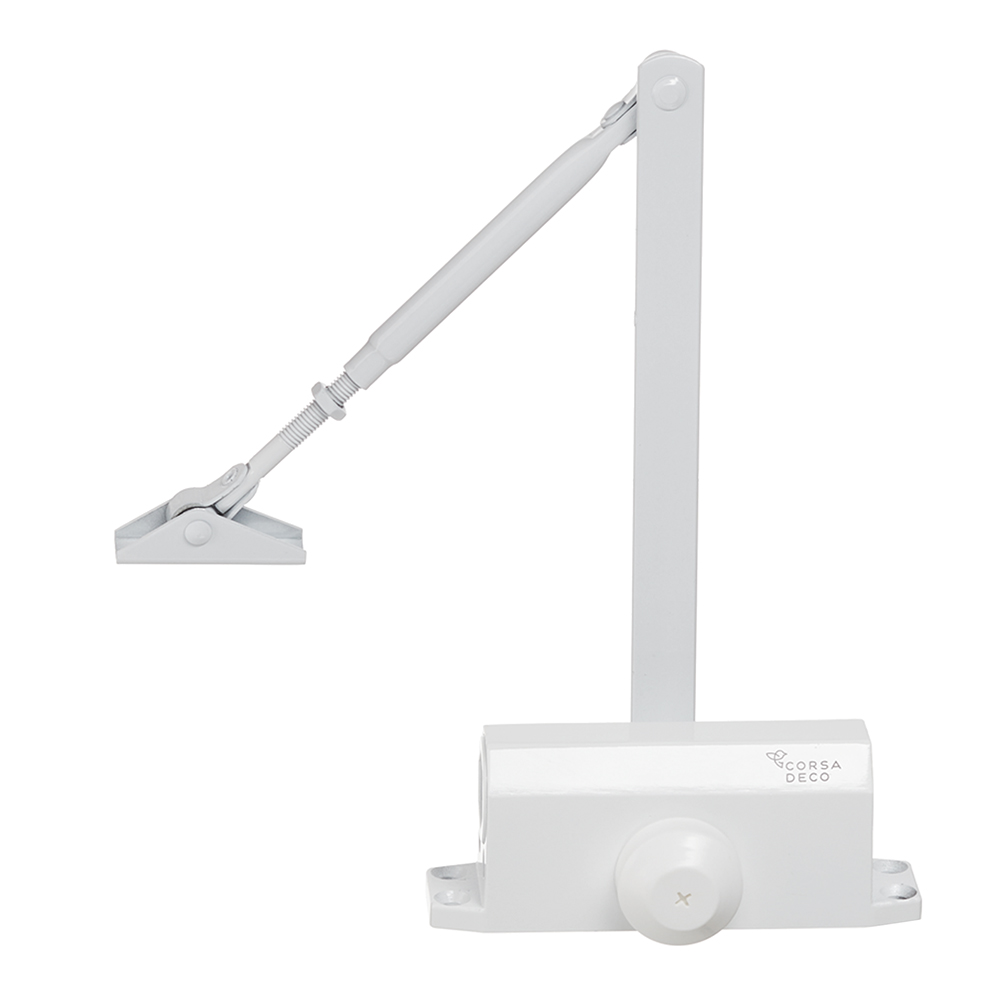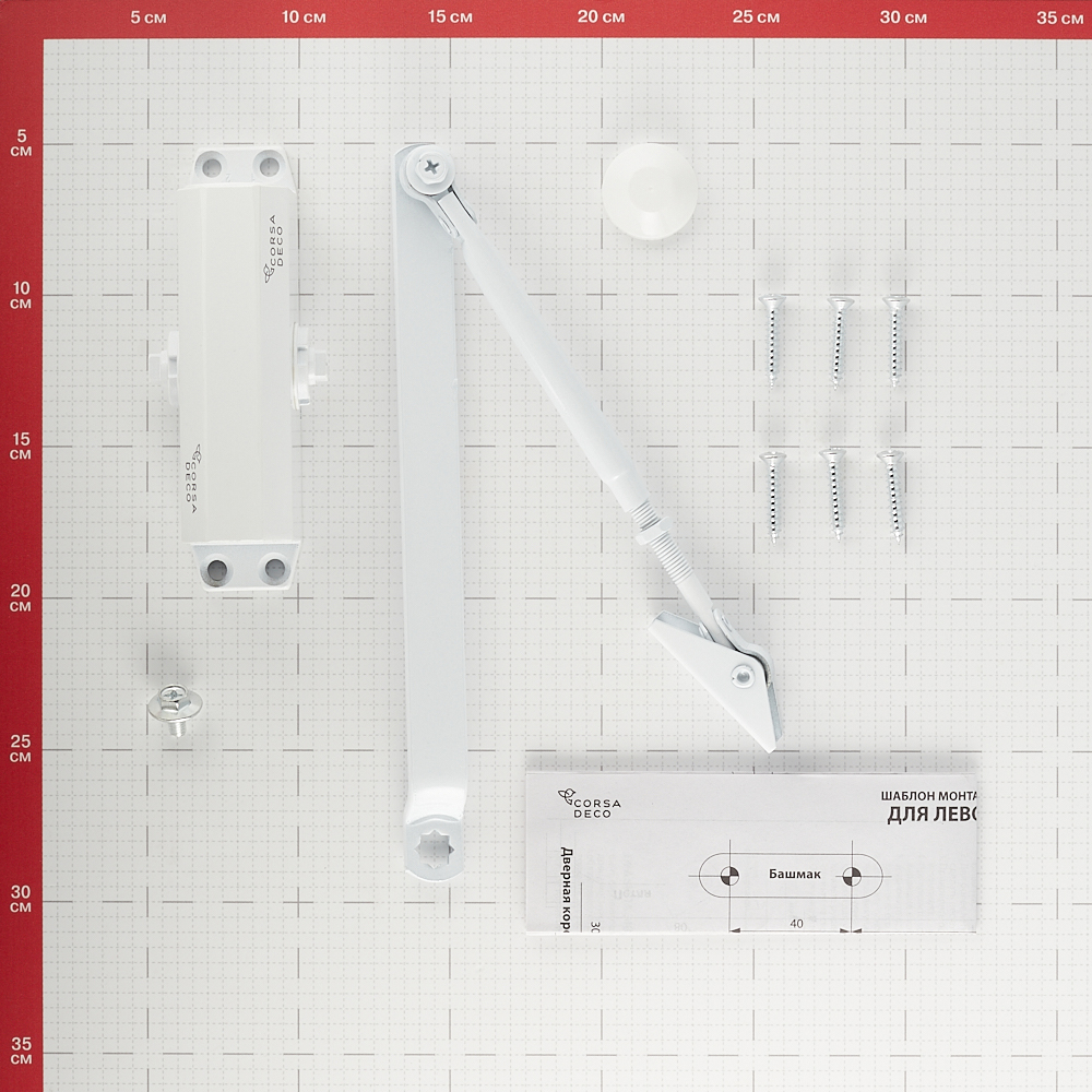 доводчик, рычаг, декоративная заглушка, комплект крепежа.