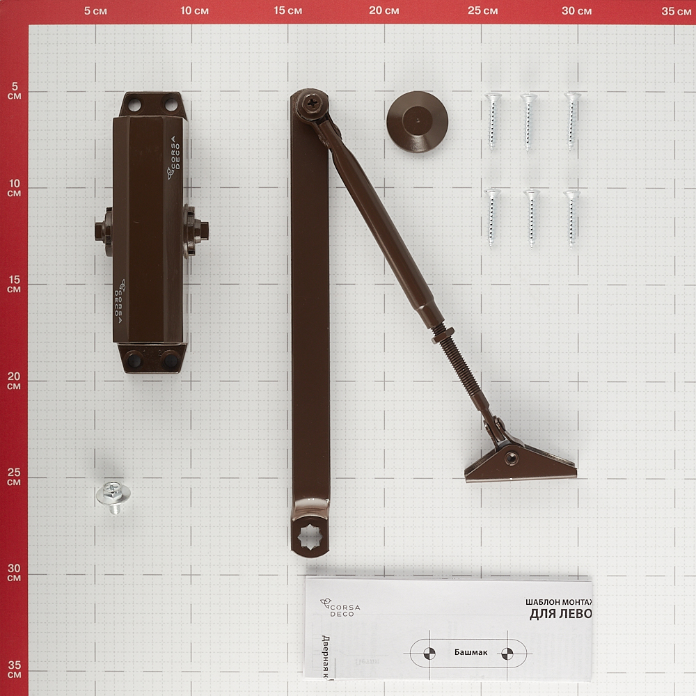 доводчик, рычаг, декоративная заглушка, комплект крепежа.