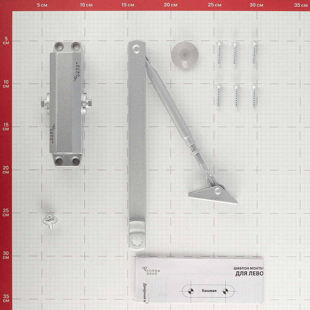 доводчик, рычаг, декоративная заглушка, комплект крепежа.