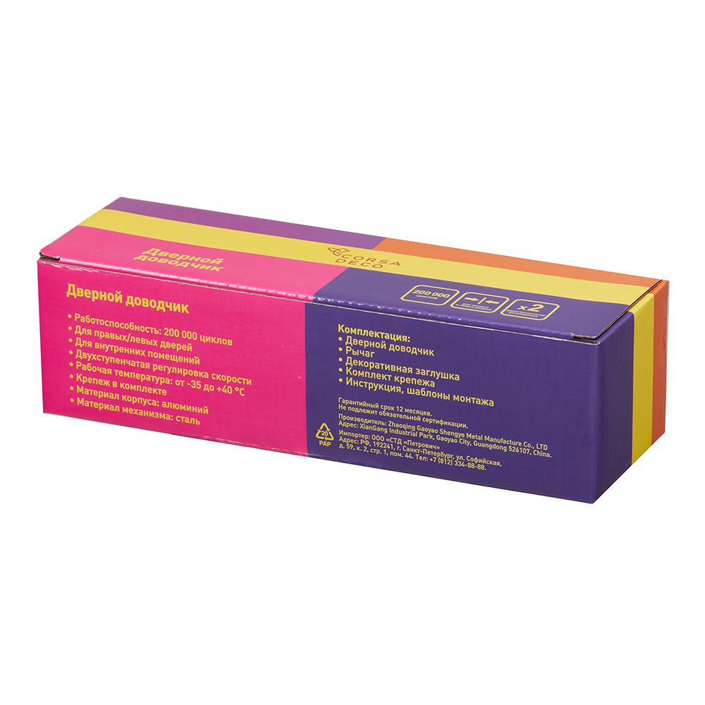 Предназначен для управления процессом открывания и закрывания дверей. Дверной доводчик устанавливается на двери, имеющие размеры дверного полотна до 900х2000 мм или массу от 25 до 45 кг. Двухступенчатая регулировка скорости (180°-20° и 20°-0°).rnРегулируемая скорость закрывания двери и скорость окончательной доводки.