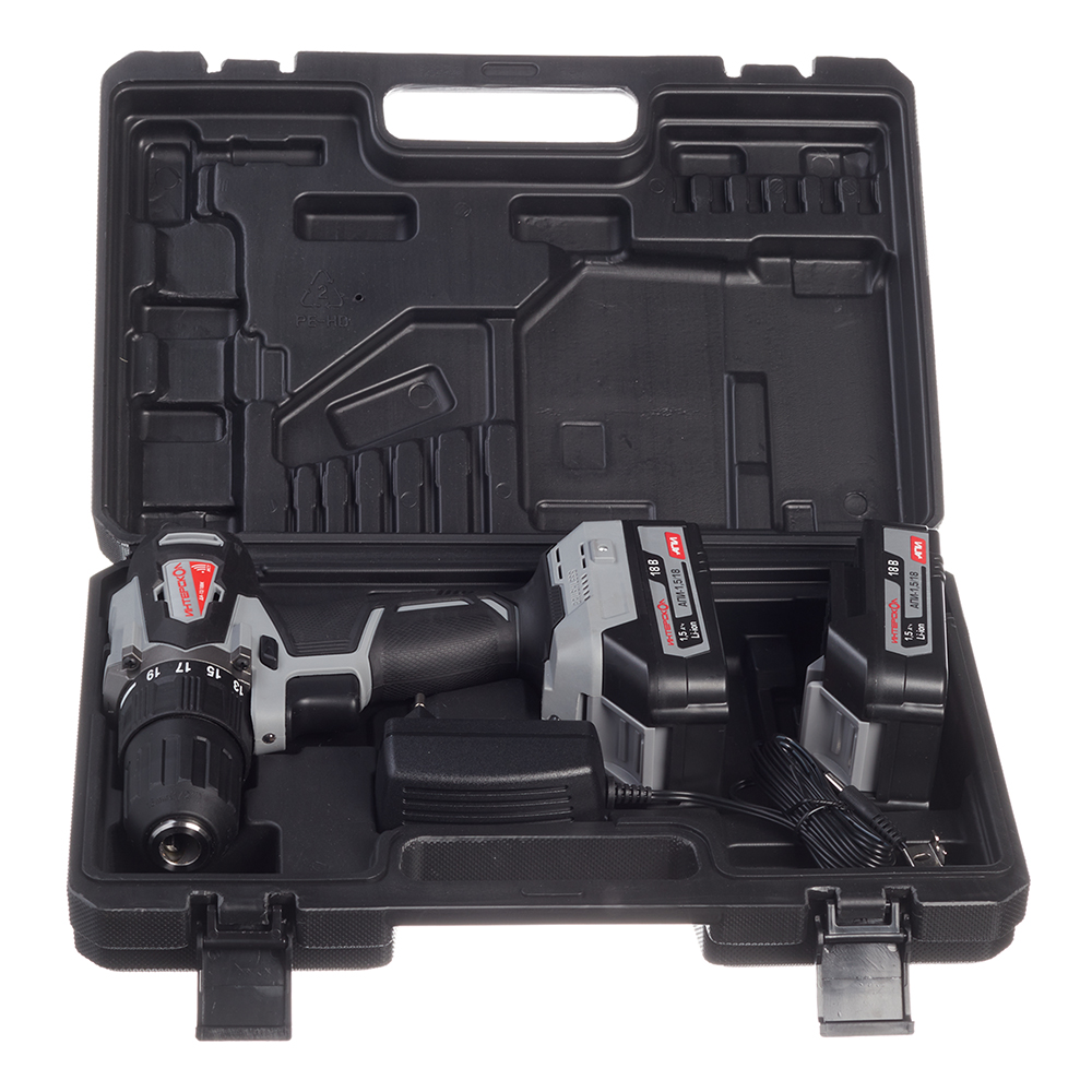 Дрель-шуруповерт, Аккумуляторный блок АПИ, Часовое моноблочное зарядное устройство, Скоба, Кейс пластмассовый, Руководство по эксплуатации и инструкция по безопасности, Гарантийный талон.