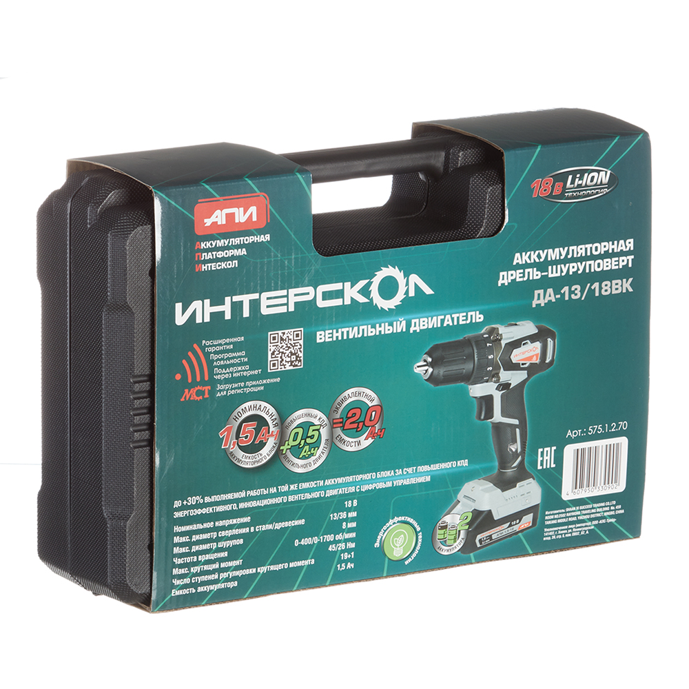 Дрель-шуруповерт аккумуляторная Интерскол ДА-13/18ВК (575.1.2.70) 18В 2х1,5Ач Li-Ion 2 АКБ иЗУ