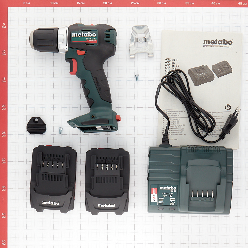 крючок для ношения на ремне и отделение для насадок, 2 аккумуляторных блока Li-Power (18 В / 2,0 А*ч), зарядное устройство SC 30, пластиковый кофр.