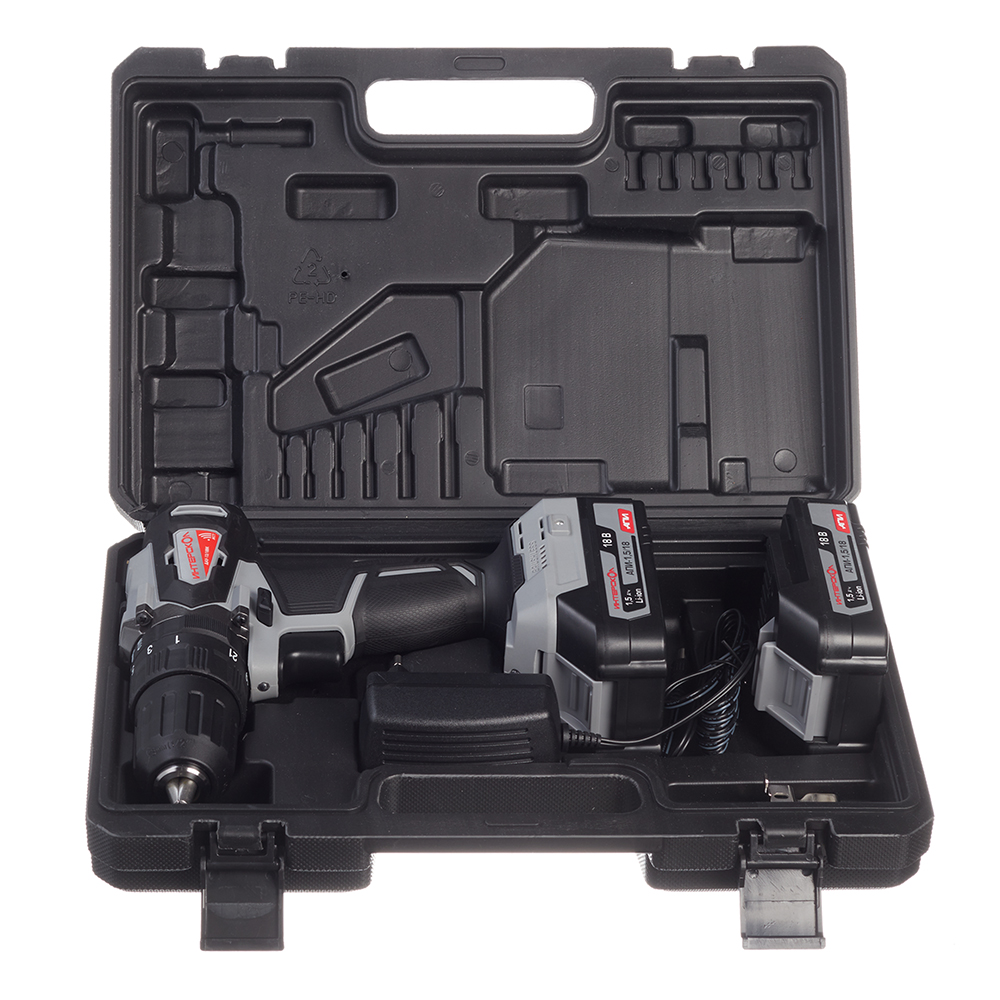Дрель-шуруповерт, Аккумуляторный блок АПИ, Часовое моноблочное зарядное устройство, Скоба, Кейс пластмассовый, Руководство по эксплуатации и инструкция по безопасности, Гарантийный талон.