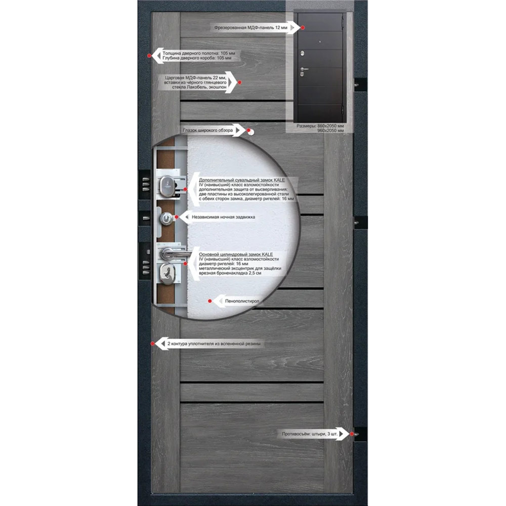 Предназначена для установки в жилых и общественных зданиях в качестве входной двери внутри помещения. При наличии тамбура и козырька может использоваться в качестве уличной входной двери. Полотно изготовлено из стали. С внутренней стороны облицовано царговой МДФ-панелью толщиной 22 мм, цвет Дуб шале графитс 5-ю вставками из черного глянцевого стекла Лакобель.