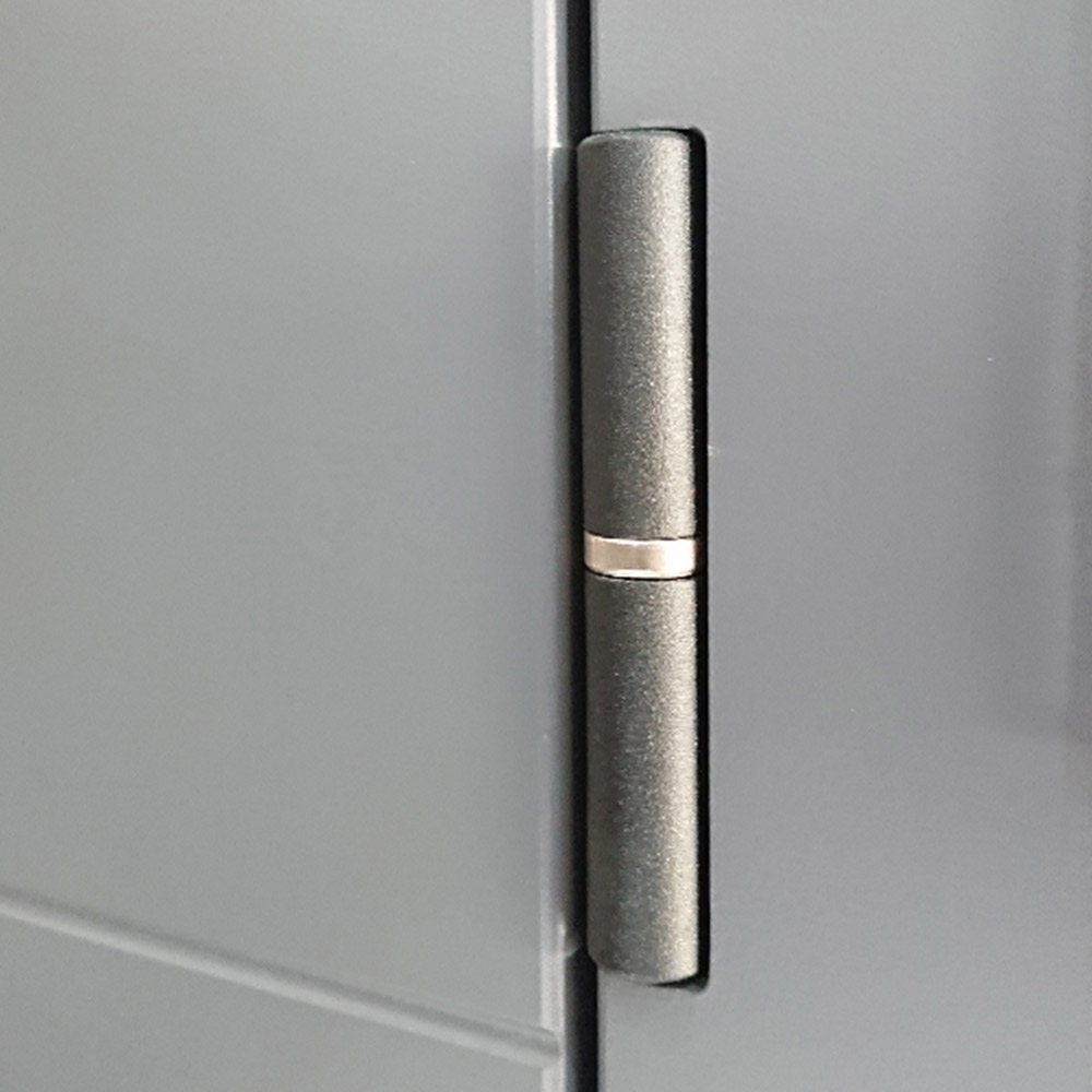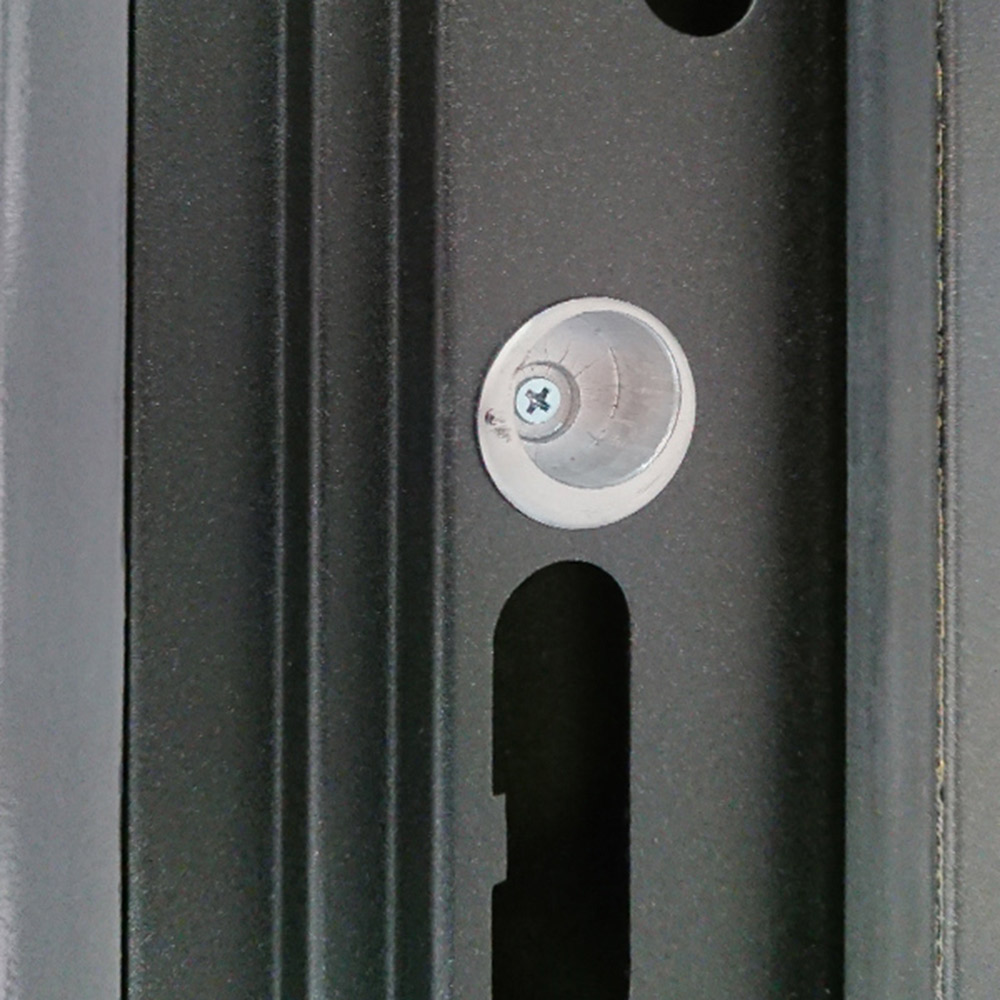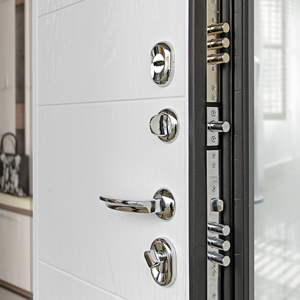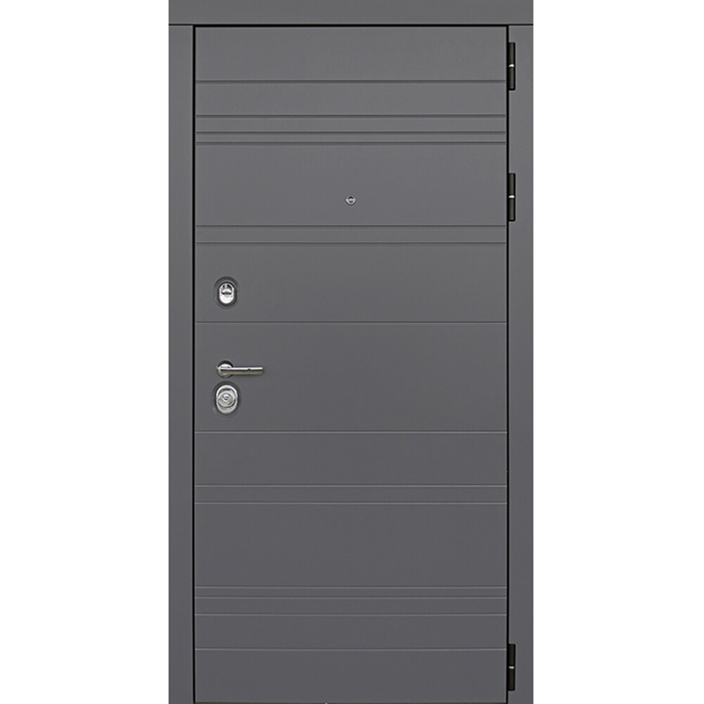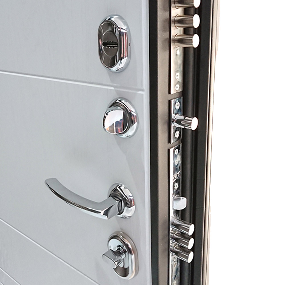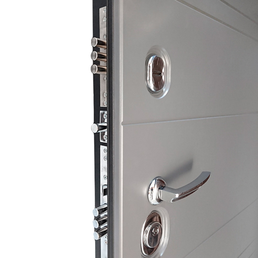 Стальной лист 1,5 мм декорированый панелью МДФ 16 мм, цвет ясень-графит; Внутренняя сторона панель МДФ, толщиной 10 мм в цвете Альберо-Браш, декорированая зеркальной вставкой; наполнение базальтовая плита высокой плотности, два замка, ночная задвижка.