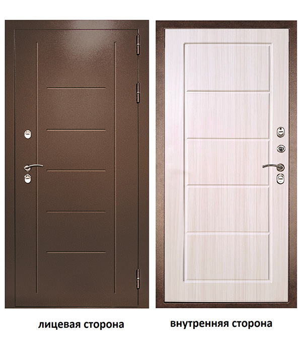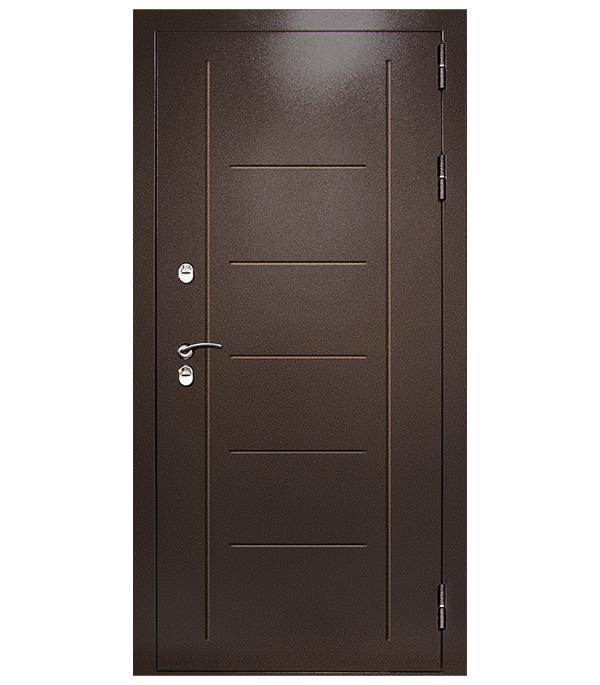 Предназначена для установки в жилых и общественных зданиях в качестве входной двери, в том числе уличной. Изделие обладает высоким уровнем тепло и шумо-изоляции за счет толщины полотна 100 мм., закрытой утепленной коробки и комбинированного наполнения полотна (пенополистирол, минеральная вата, термоизолятор). Конструкцией защищена от продувания за счет трех контуров уплотнения. Наружная поверхность двери покрыта порошковой атмосферостойкой краской, цвета Медный Антик. Внутренняя панель – МДФ, цвета Лиственница белая.