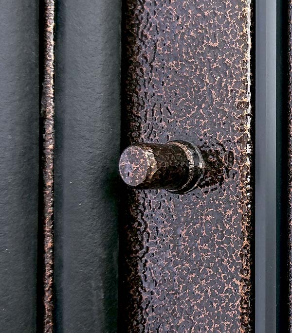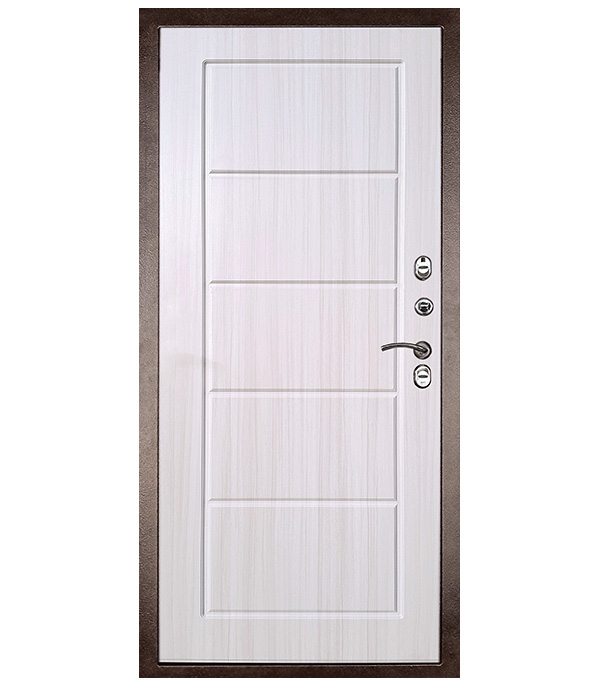 Дверь с Терморазрывом. Стальной лист 1,4 мм с атмосферостойким порошковым покрытием цвета медный антик; панель МДФ, толщиной 12 мм в цвете лиственница белая; комбинированное внутреннее заполнение, в составе базальтовая плита/пенополистирол/ДСП/фольгируемый пенофол, терморазрыв по полотну и раме двери, утепленный короб.