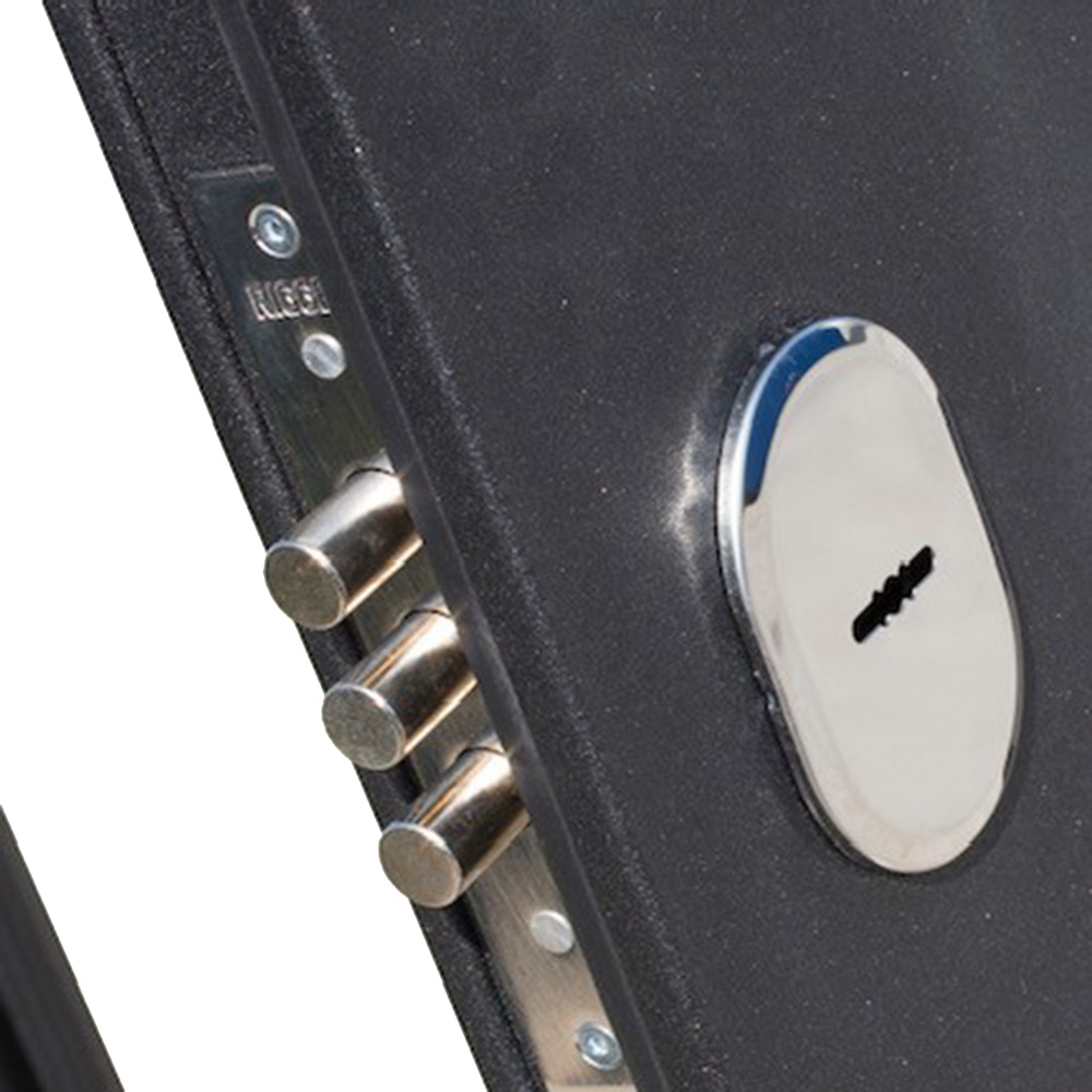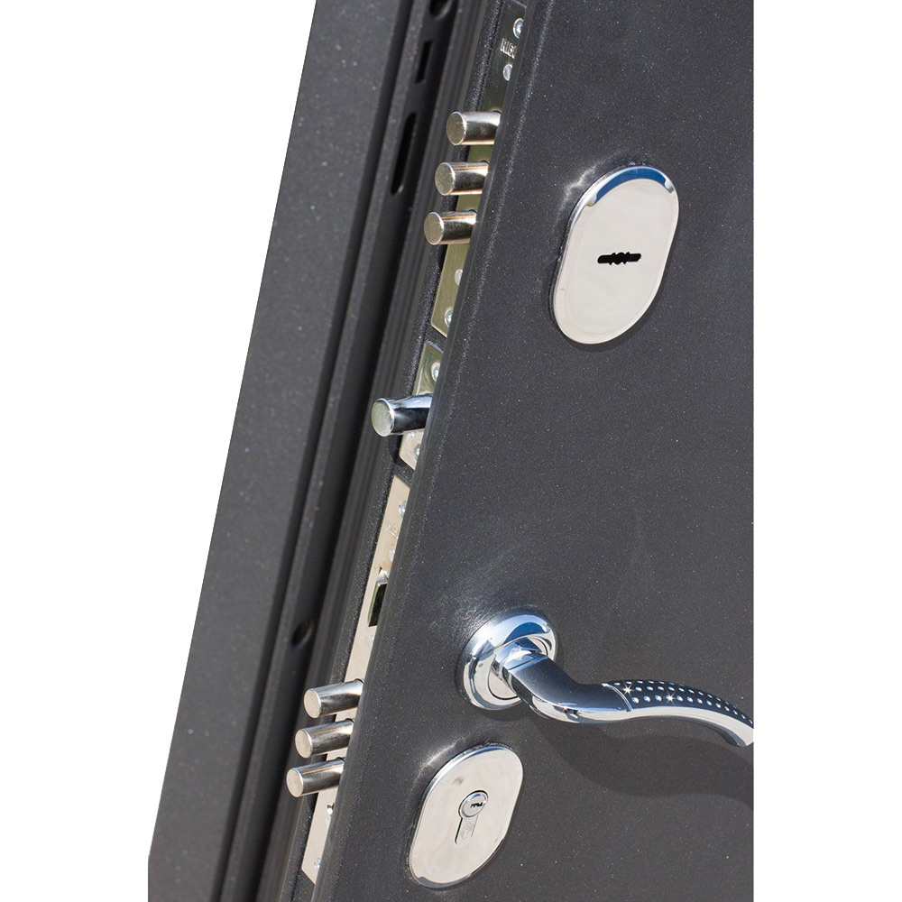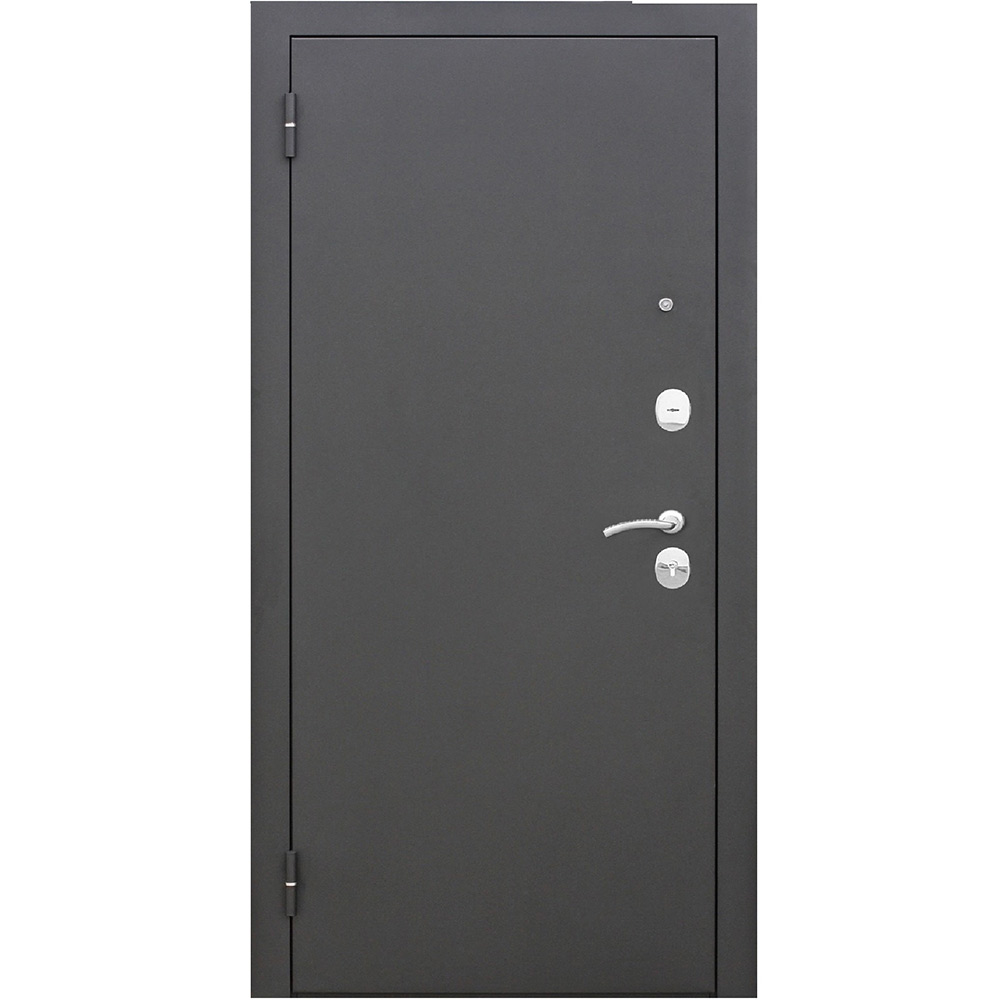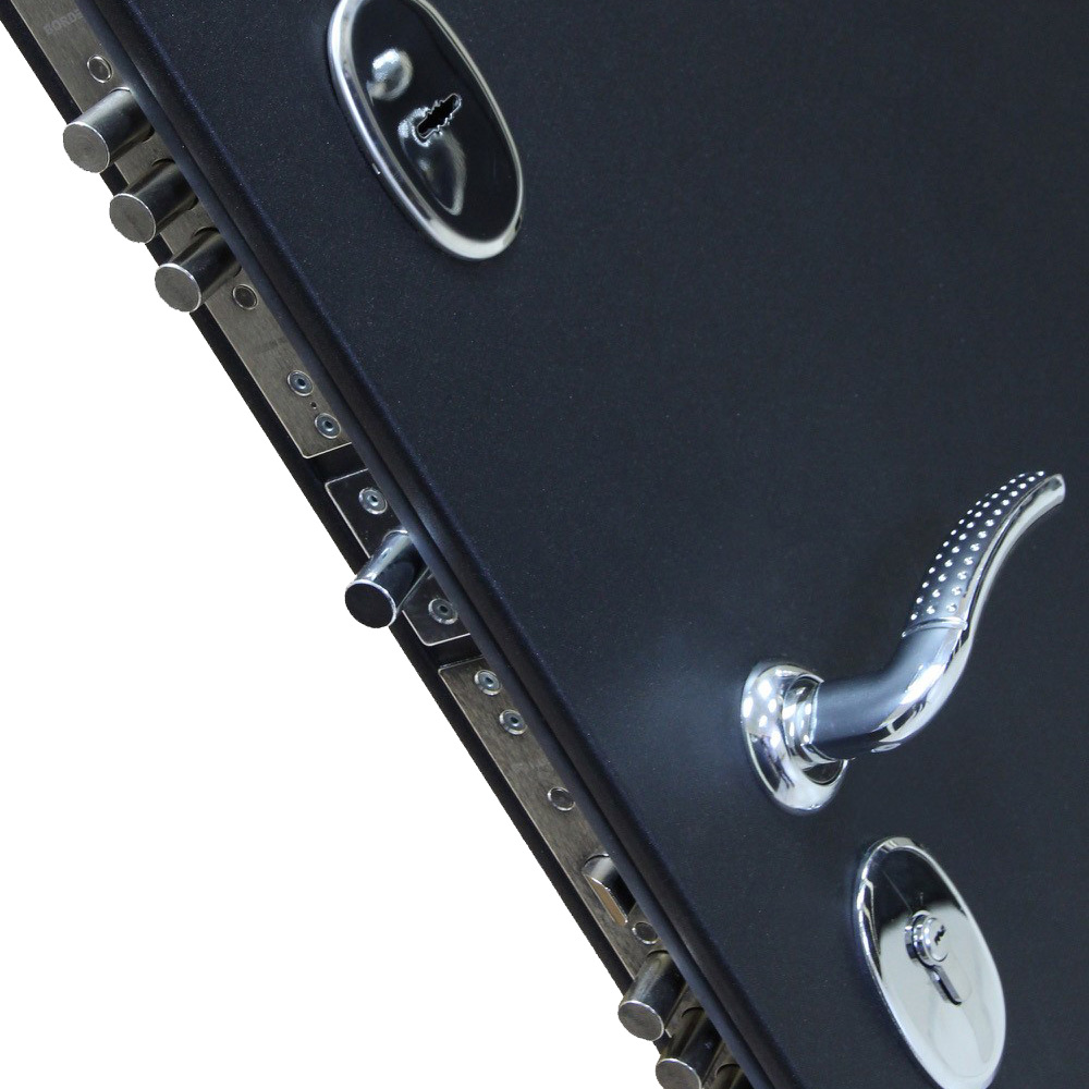 Дверное полотно; Коробка с наличником; Две петли на опорном подшипнике; Противосъемные ригели (2 шт.); Глазок 60-90 мм, угол обзора 160 градусов; Основной замок цилиндровый RIGGER 1211; Цилиндр с вертушкой и комплектом из 5 ключей (закреплен на раме двери); Дополнительный замок сувальдного типа RIGGER 1001 5 ключей в комплекте; Ночная задвижка; Два контура уплотнения (1 на полотне, 1 на раме); Комплект ручек со стяжными болтами (расположены в верхней части рамы двери).
