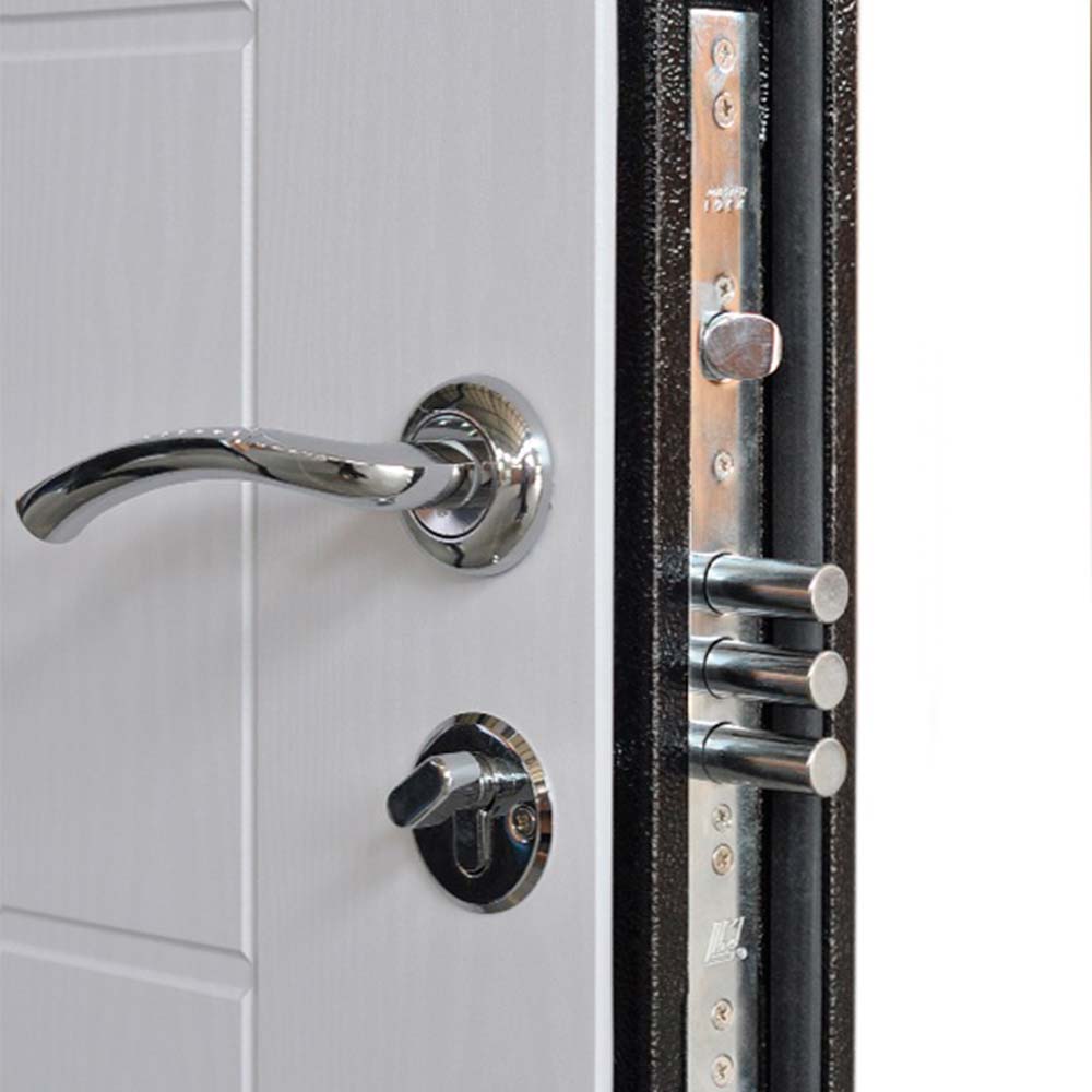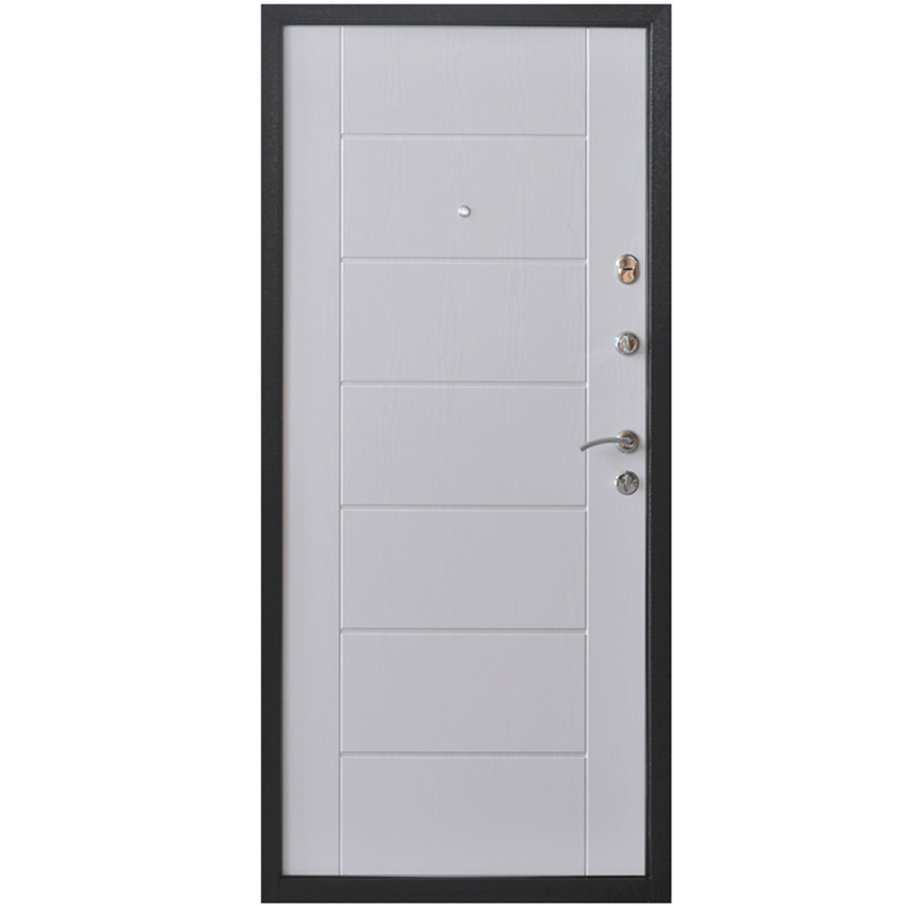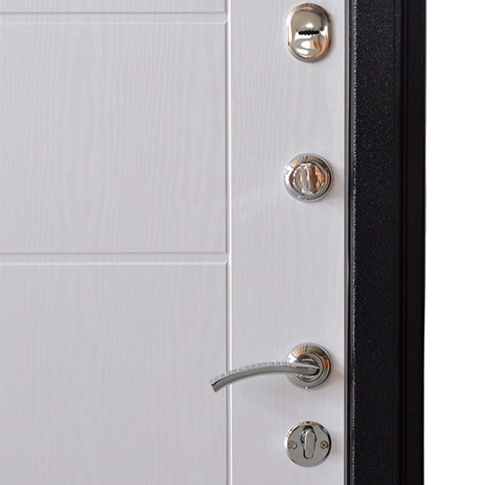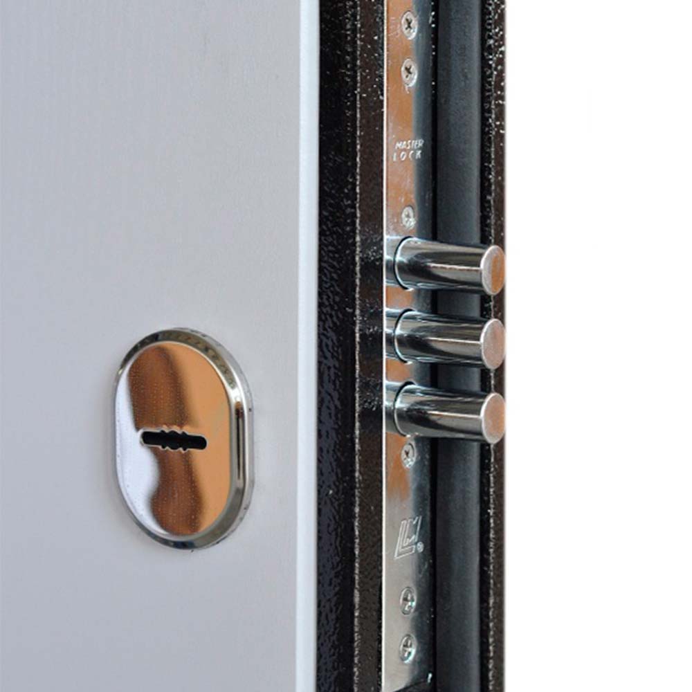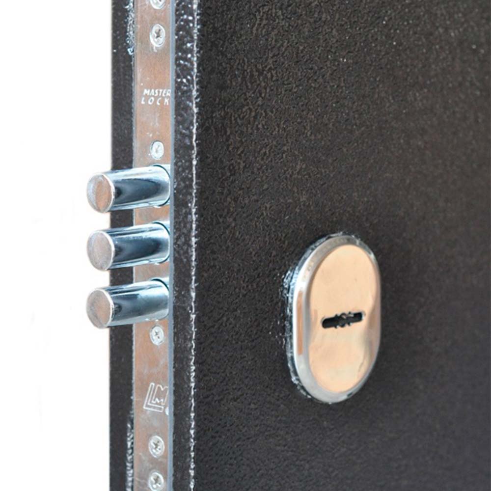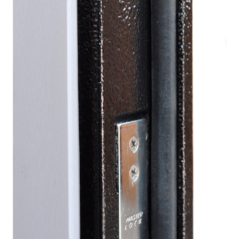 Дверь металлическая наружная, предназначена для защиты помещения (квартиры, офиса, дома, и любого другого помещения закрытого типа) от проникновения посторонних лиц. Допускается установка на улице при наличии холодного тамбура и навеса не менее 80 см. Обладает высокой тепло и шумоизоляцией за счет толщины полотна 68 мм., наполнения минеральной ватой и двух контуров уплотнения. Две петли наружные на опорных подшипниках. Защиту от взлома обеспечивают два замка разного типа: основной замок цилиндровый, дополнительный замок сувальдного типа. Снаружи дверь покрыта атмосферостойкой порошковой краской, цвет темный антик, внутренняя панель из МДФ цвета беленый дуб.rnДополнительный замок сувальдный Master-Lock (в комплекте 4 ключа, закрепленные на раме двери); rnДва контура уплотнения; rnВнутренний притвор; rnАнкерные болты в комплект поставки не входят и приобретаются отдельно.rnКомплект ручек со стяжными болтами (расположены в верхней части рамы двери).