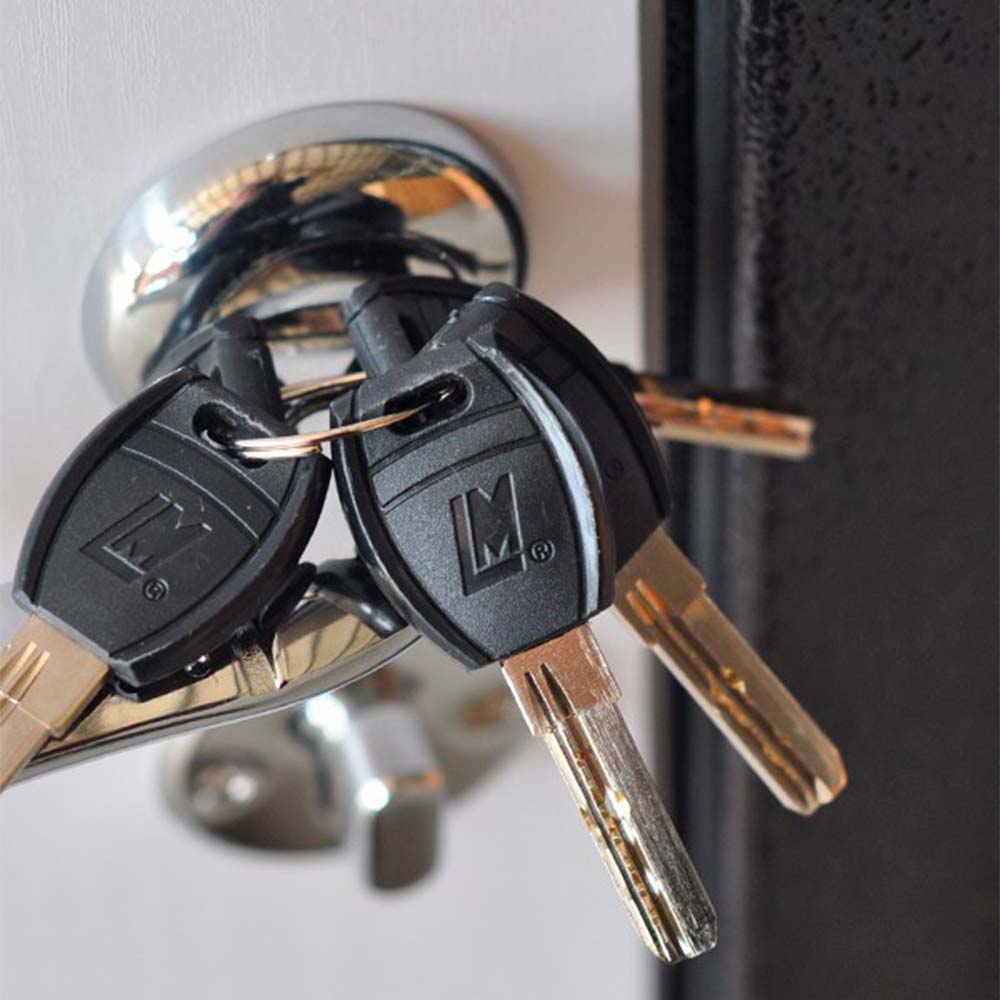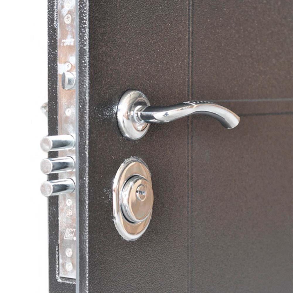 три ригеля, цилиндр с вертушкой и комплектом 5 ключей (закреплен на раме двери).