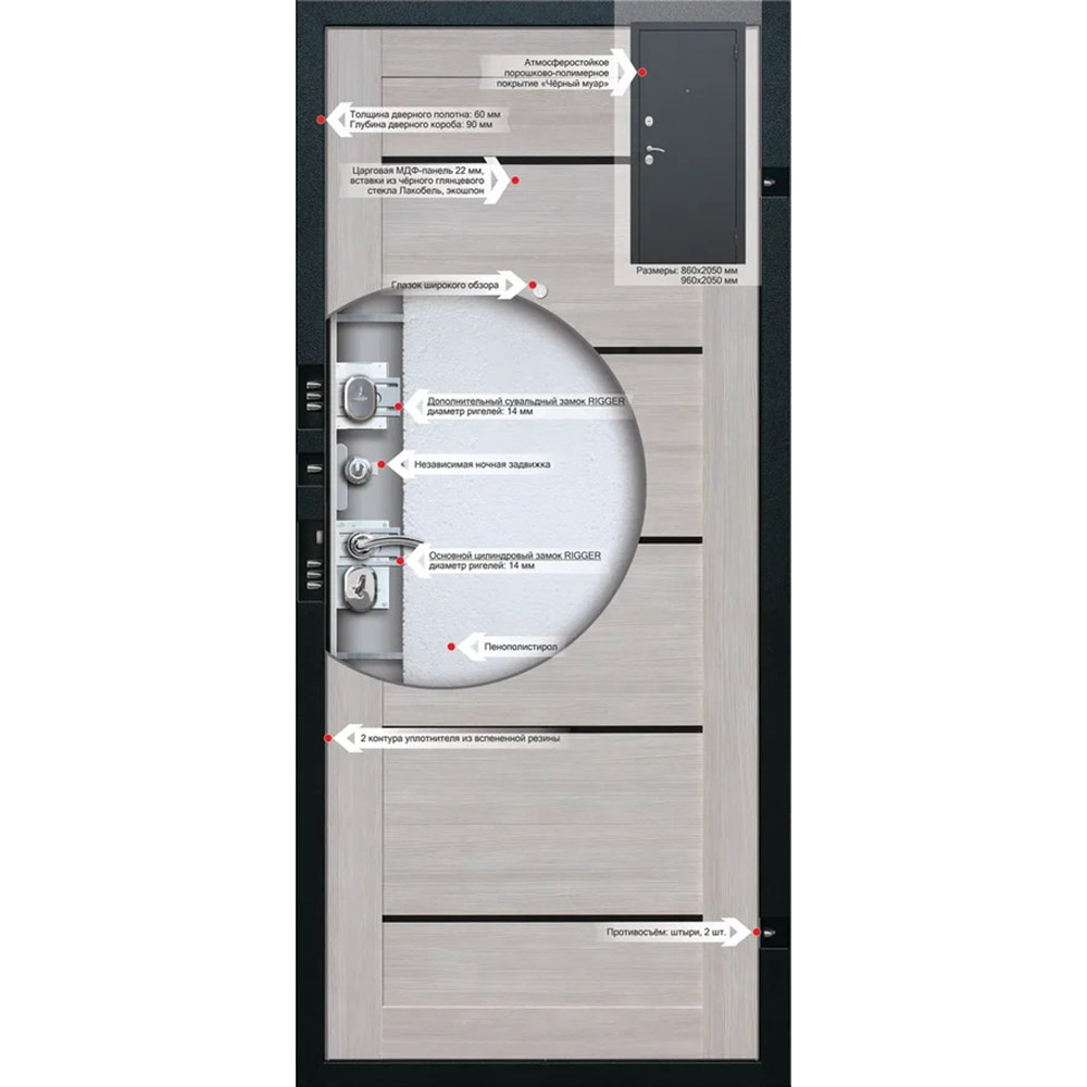 Предназначена для установки в жилых и общественных зданиях в качестве входной двери внутри помещения. При наличии тамбура и козырька может использоваться в качестве уличной входной двери. Полотно изготовлено из стали. С внутренней стороны облицовано царговой МДФ-панелью толщиной 22 мм, цвет Лиственница Моккос 5-ю вставками из черного глянцевого стекла Лакобель.