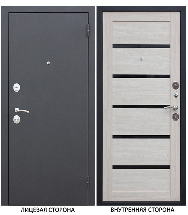 Стальной лист 1,2 мм с атмосферостойким порошковым покрытием цвета Черный муар ; царговая панель МДФ 22 мм, цвета Лиственница Моккос вставками из стекла Лакобель; наполнение пенополистиролом.