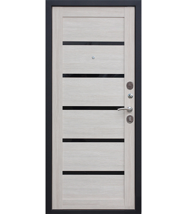 Предназначена для установки в жилых и общественных зданиях в качестве входной двери внутри помещения. При наличии тамбура и козырька может использоваться в качестве уличной входной двери. Полотно изготовлено из стали. С внутренней стороны облицовано царговой МДФ-панелью толщиной 22 мм, цвет Лиственница Моккос 5-ю вставками из черного глянцевого стекла Лакобель.