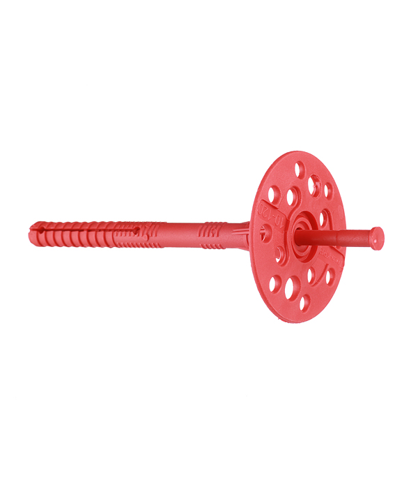 Предназначен для крепления легких теплоизоляционных изделий к внутренним и наружным поверхностям зданий различного назначения, в том числе в системах вентилируемых фасадов, штукатурных фасадов и колодезной кладке, в такие основания, как тяжелый и легкий бетон, полнотелый керамический и силикатный кирпич, керамзитобетонный блок. За счет широкой шляпки дюбель часто называют парашютили тарельчатый дюбель. Конструкция широкой шляпки дюбеля плотно прижимает теплоизоляцию, отверстия позволяют утопить дюбель в клее без потери эластичности шляпки. В комплекте с дюбелем поставляется пластмассовый гвоздь, который для большей прочности армирован стекловолокном.