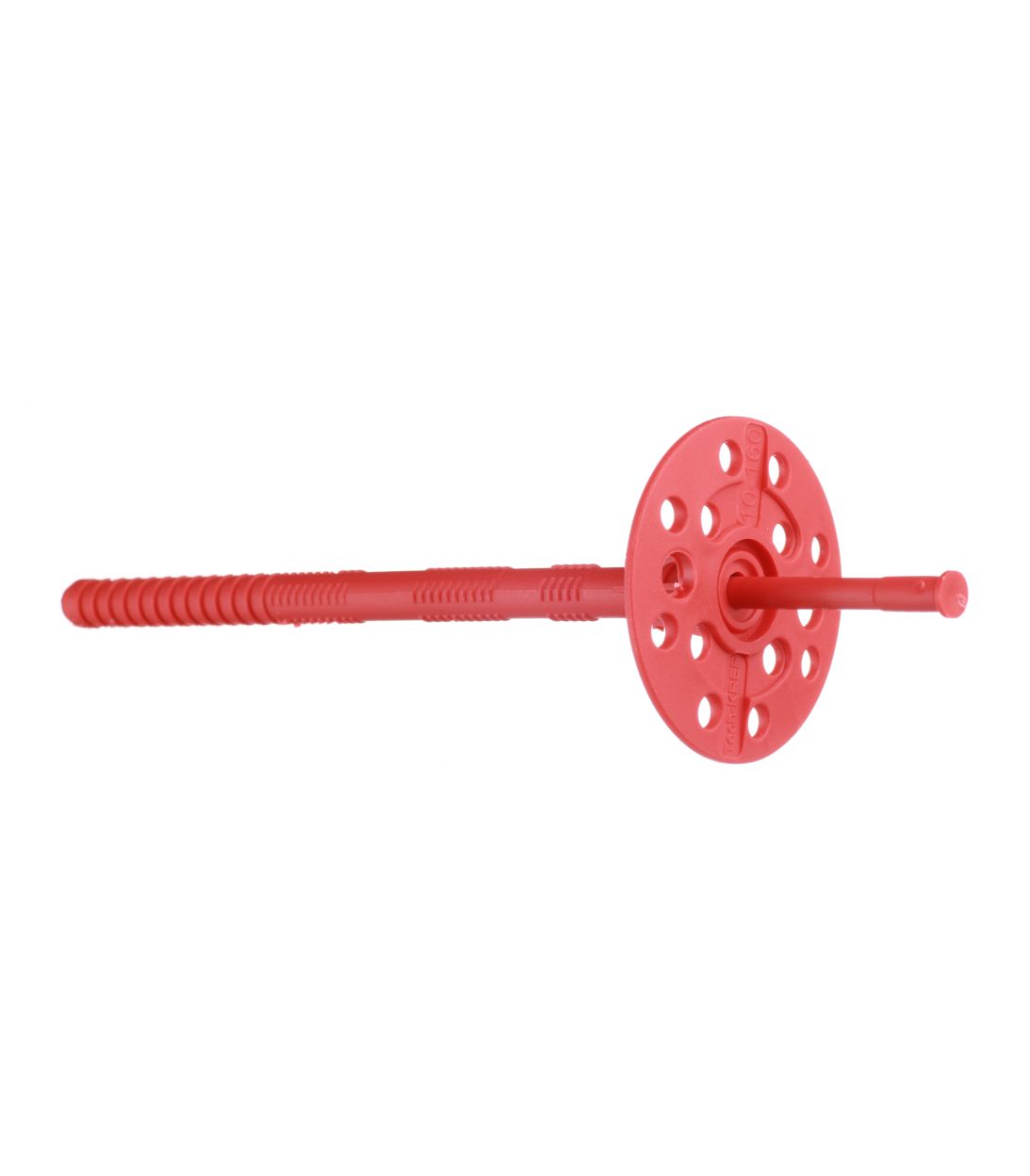 Пластмассовые стержни изготовлены из полиамида, модифицированного стекловолокном с высокой ударной вязкостью, или полипропилена. металлические стержни – стальные, с гальваническим цинковым покрытием, в ряде случаев – с характерным черепичным витком резьбы. rnПрименяются для механического крепления тяжелых теплоизоляционных плит из минеральной ваты и легких материалов типа пенополистирола к бетонным основаниям (бетон, кирпич, камень), пустотелым материалам (пустотелый блок, дырчатый кирпич).rnМонтаж соединителя производится механическим вбиванием стержня. Конструкция тарелкидюбеля позволяет легкое покрытие слоем штукатурки. Благодаря использованию материалов, стойких к атмосферным условиям, не возникает термических мостиков, что обеспечивает долгую сохранность фасада.