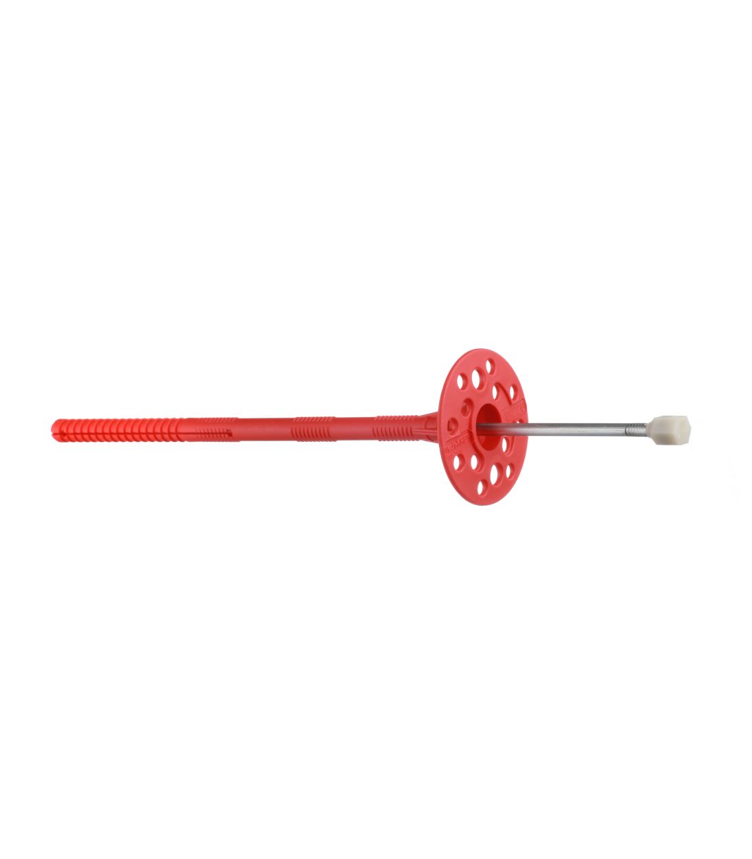 Пластмассовые стержни изготовлены из полиамида, модифицированного стекловолокном с высокой ударной вязкостью, или полипропилена. металлические стержни – стальные, с гальваническим цинковым покрытием, в ряде случаев – с характерным черепичным витком резьбы. rnПрименяются для механического крепления тяжелых теплоизоляционных плит из минеральной ваты и легких материалов типа пенополистирола к бетонным основаниям (бетон, кирпич, камень), пустотелым материалам (пустотелый блок, дырчатый кирпич).rnМонтаж соединителя производится механическим вбиванием стержня. Конструкция тарелкидюбеля позволяет легкое покрытие слоем штукатурки. Благодаря использованию материалов, стойких к атмосферным условиям, не возникает термических мостиков, что обеспечивает долгую сохранность фасада.