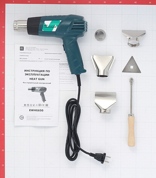Фен электрический, руководство по эксплуатации, скребок, 4 насадки: щелевая насадка для обработки поверхностей, идеальна для снятия краски; дефлекторная насадка, защищающая поверхности при работе (например, стекло); рефлекторная насадка для изменения формы пластмассы, например для усадки кабеля и обработки труб; очечная насадка, для обработки поверхностей маленьких площадей и мягкой пайки.